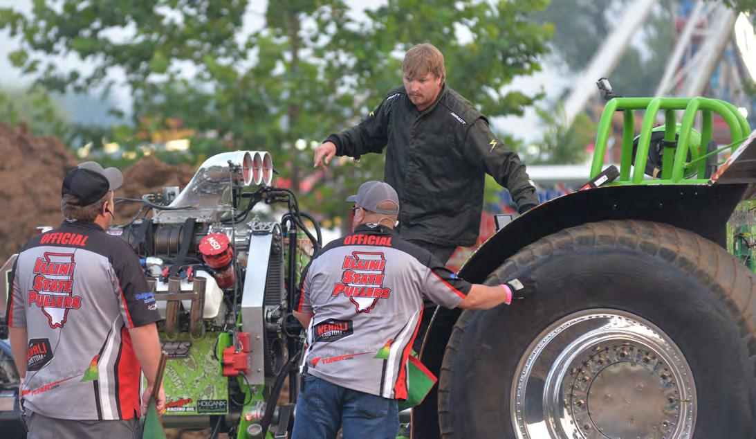 Logan Dornbush of Albany talks to Illini State Pullers officials after making a run in his modified tractor “Joker” in the open division of the tractor pull July 31 at the Ogle County Fair in Oregon.