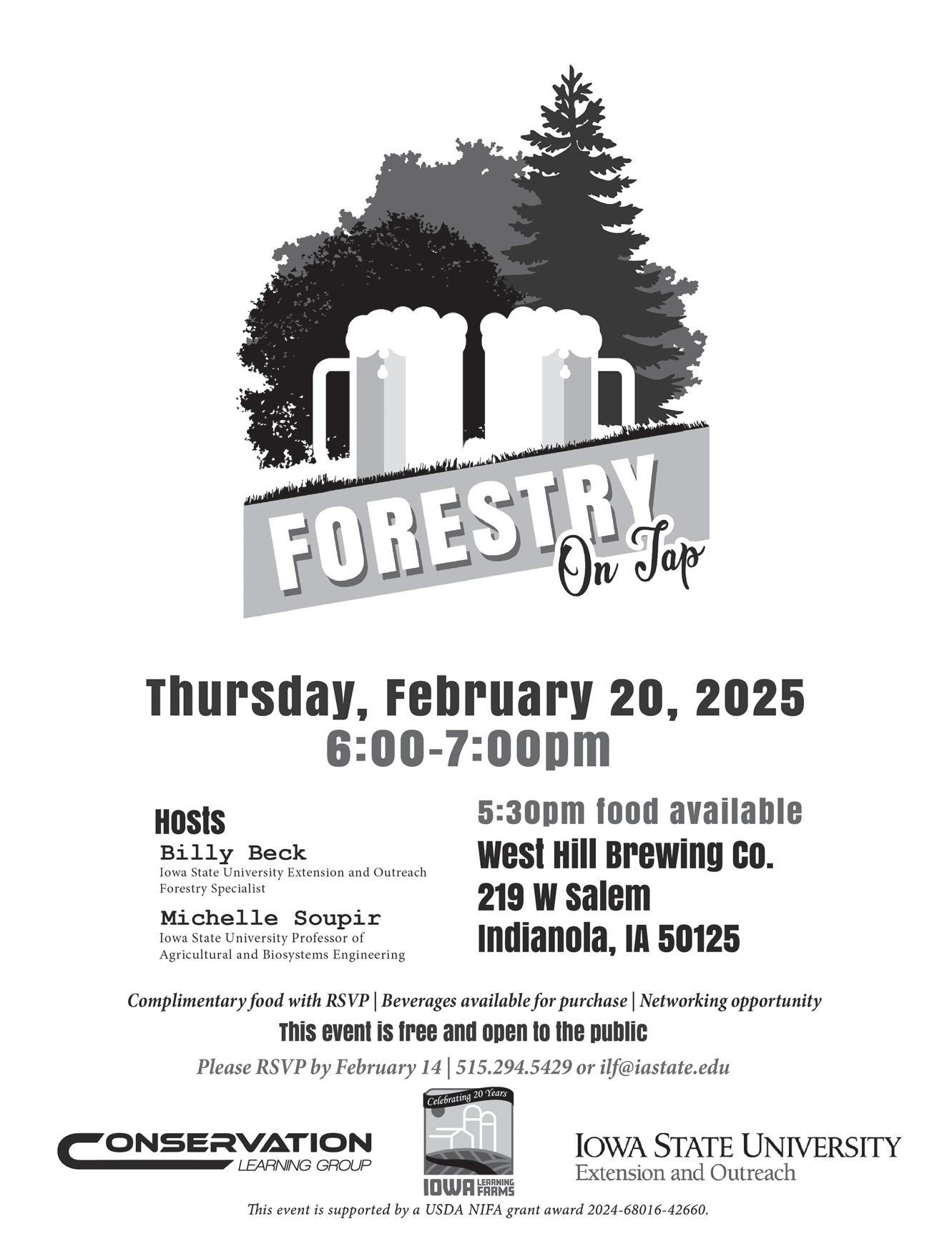 Iowa Learning Farms, in partnership with Conservation Learning Group and Warren County Iowa State University Extension and Outreach will host “Forestry On Tap,” from 6 to 7 p.m. Thursday, Feb. 20 at West Hill Brewing Co. in Indianola with complimentary food and beverages available for purchase beginning at 5:30pm.