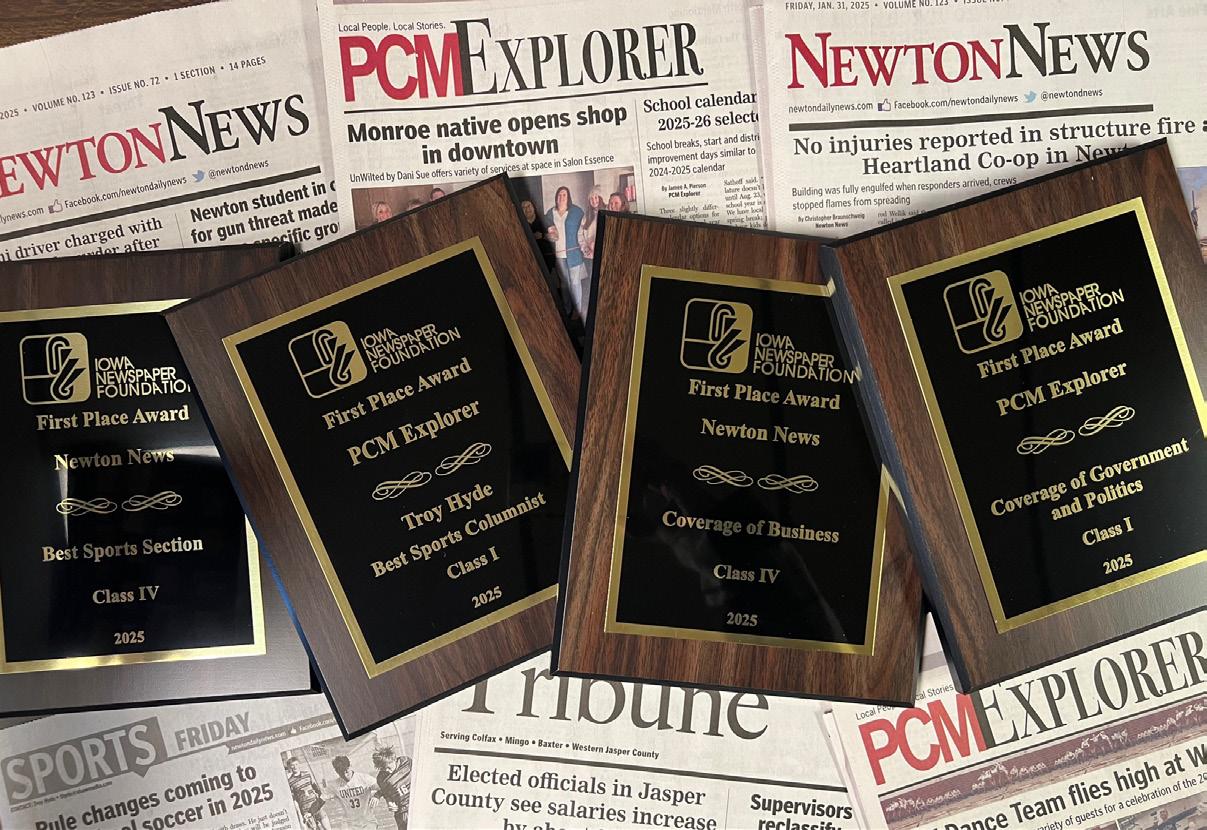 Newton News and the PCM Explorer took home four firstplace plaques last week at the Iowa Newspaper Association Convention and Awards Ceremony in downtown Des Moines. Both newspapers, along with the Jasper County Tribune, received top-three placements in 14 categories for their reporting, photography and graphics.