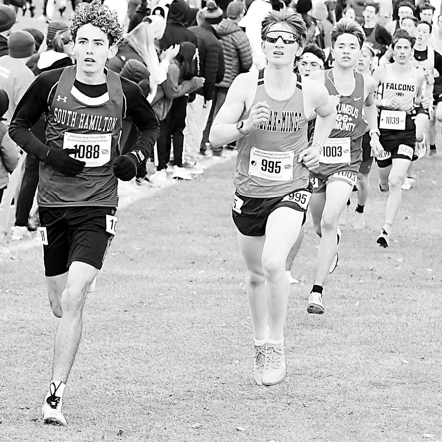 Troy Hyde/Jasper County Tribune Baxter sophomore Maddux Tuhn, right, runs in the state cross country meet in Fort Dodge on Nov. 1. Tuhn placed 46th in his first state experience.