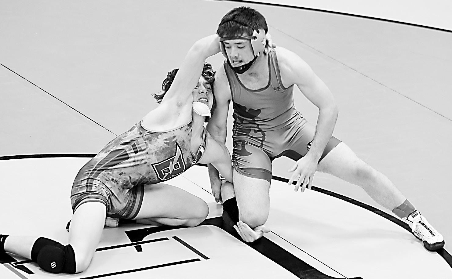 Colfax-Mingo senior Caden Sykes, top, won four times at the Pleasantville dual tournament on Dec. 21.