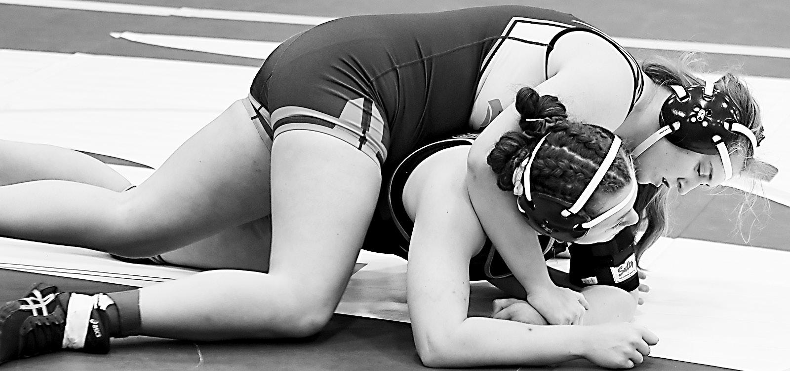 Colfax-Mingo junior Emmalyn Buchman, top, made her season debut and was sixth at 190 pounds after going 2-2 with two pins at the Saydel Girls Invitational on Dec. 16.