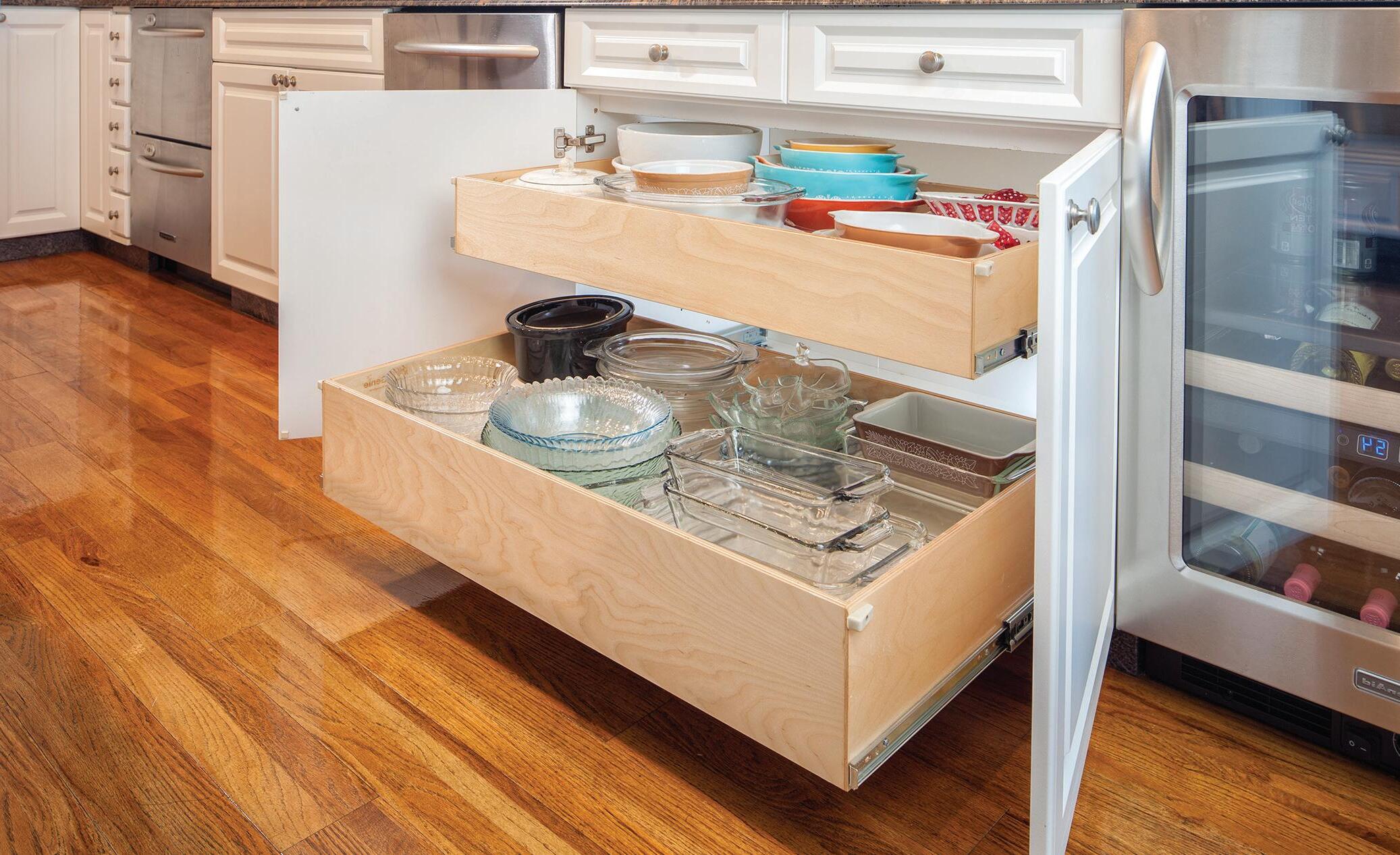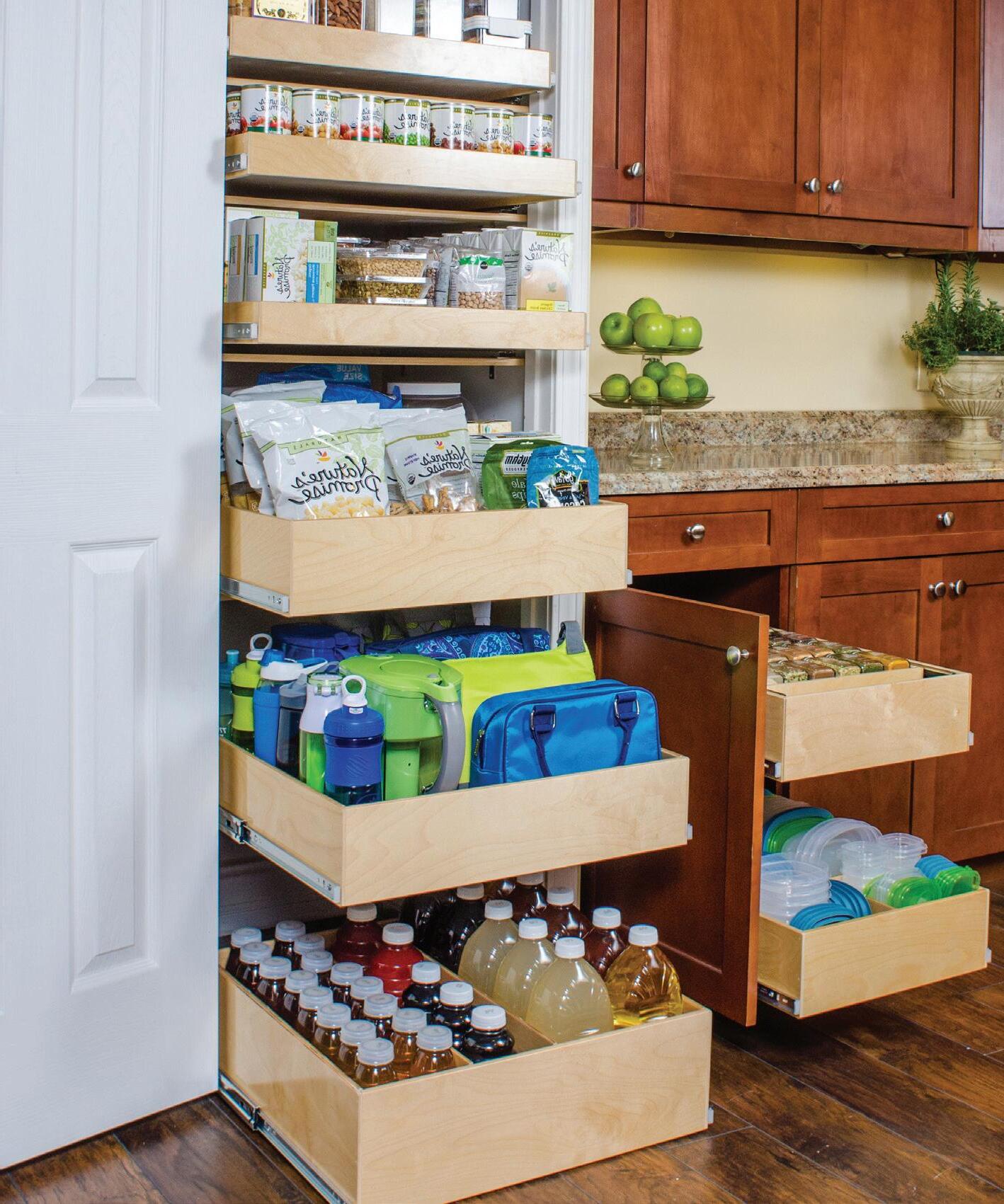 the pantry. Some items never emerge from this area, as cooks forget they’re there and then purchase duplicates, which inevitably contributes to storage issues. Roll-out shelving ensures all items in the pantry can be found and greatly reduces the likelihood that cooks will have lots of duplicate items taking up precious kitchen space.