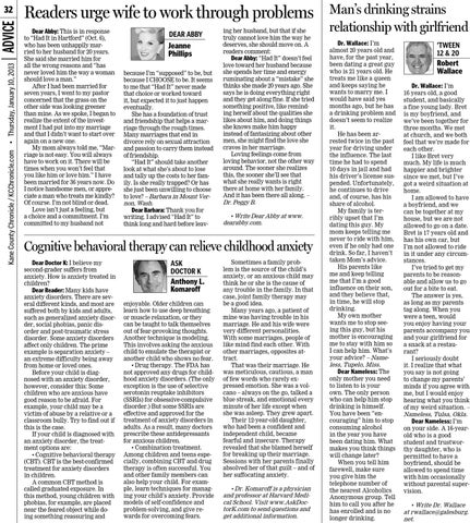 ing her husband, but that if she truly cannot love him the way he deserves, she should move on. A readers comment: Dear Abby: “Had It” doesn’t feel love toward her husband because she spends her time and energy ruminating about a “mistake” she thinks she made 20 years ago. She says he is doing everything right and they get along fine. If she tried something positive, like reminding herself about the qualities she likes about him, and doing things she knows make him happy instead of fantasizing about other men, she might find the love she craves in her marriage. Loving feelings come from loving behavior, not the other way around. The sooner she realizes this, the sooner she’ll see that what she really wants is right there at home with her family. And it has been there all along. – Dr. Peggy B. • Write Dear Abby at www. dearabby.com.