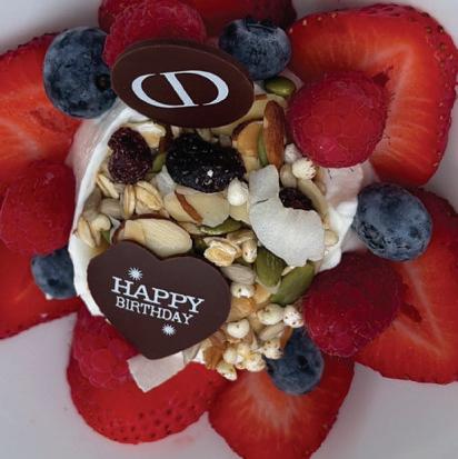 Trendy is an understatement — this is a place where the who’s who go to catch one picture. But when you take a look at their menu, a lot of what you see is sugar-laden or fattening. I was not going to give in, so I found this wonderful, trendy version of a parfait. With the delectable Greek yogurt in a star shape, you got your protein packed. Trendily adorned were the berries (blueberries, strawberries, raspberries and blackberries). Topped with a little homemade granola that had the elegance of design and freshness, this was not a typical parfait. It was glam! Topped with a gold leaf with the imprint seen in the highend purses. Christian Dior had an imprint on my parfait!