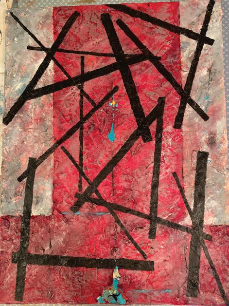 of calm and serenity.” In the coming months, she will work to scale up some of her work and add depth to her mixed media creations. “Future goals are to create large organic pit-fired ceramic pieces and to incorporate more 3D elements into my mixed media framed art pieces,” she says.