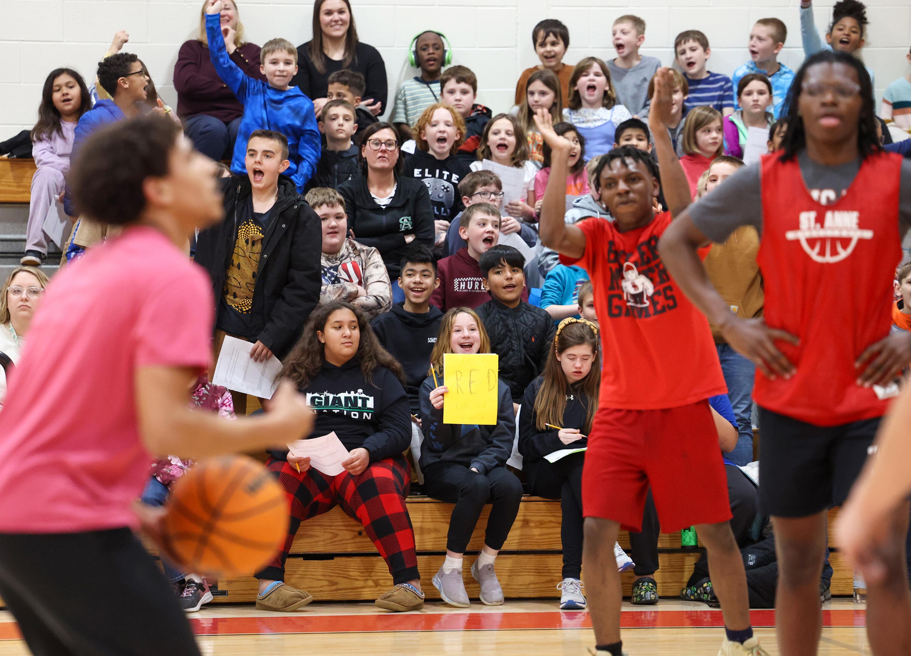 St. Anne Grade School students joyfully cheer for St. Anne High School basketball players during a collaborative event called Math Madness held March 20 at the high school. The newly formed St. Anne School District 24, a consolidation of the high school and grade school districts, is being recognized with a 2025 Progress Award for Excellence in Education.