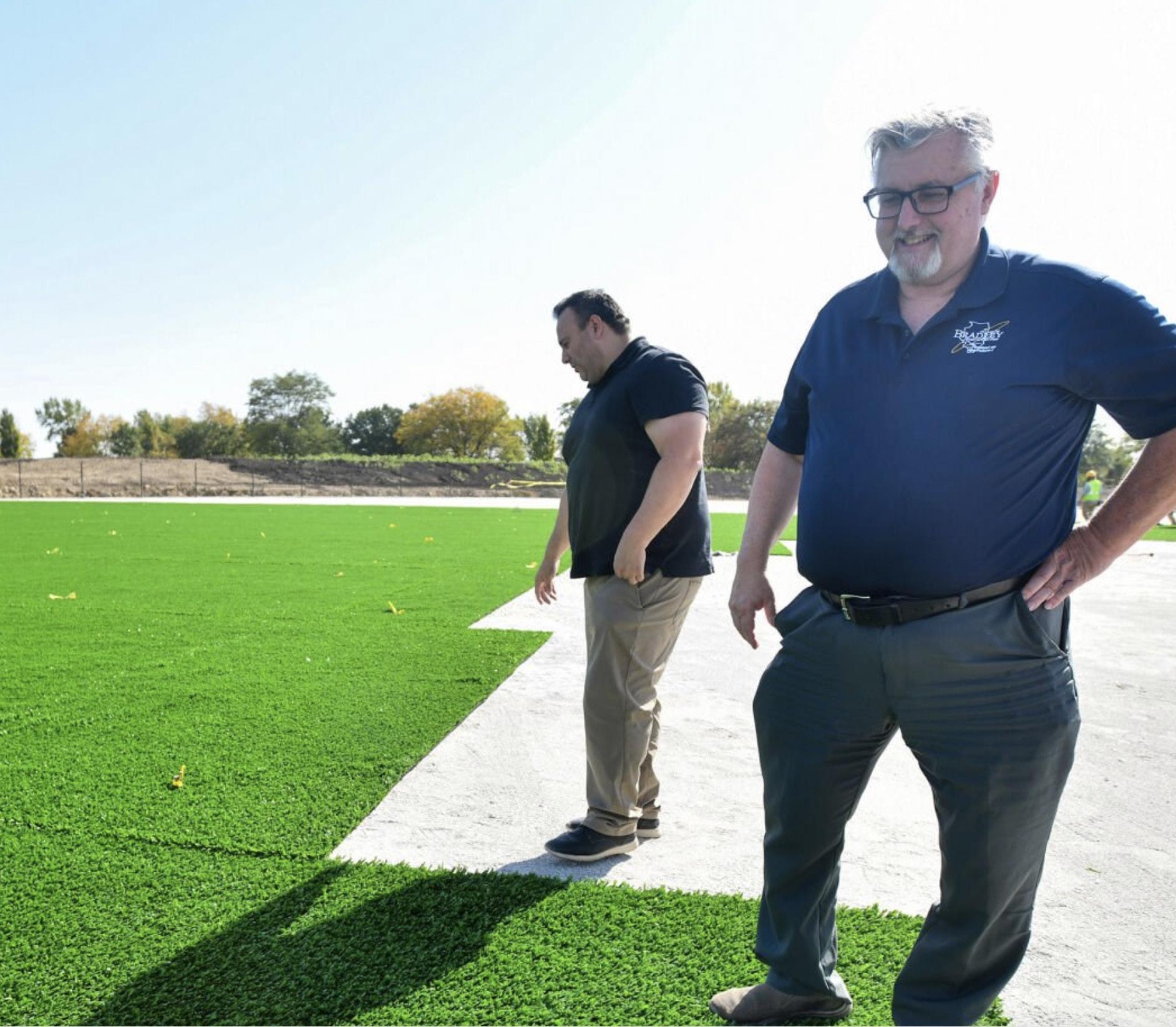 Bradley Mayor Mike Watson (right) and finance director Rob Romo stand on some of the first turf installed at the new Bradley sports complex project in October 2024. The 12-diamond complex is just one of the developments Bradley is investing in as growing cash reserves fuel developments.