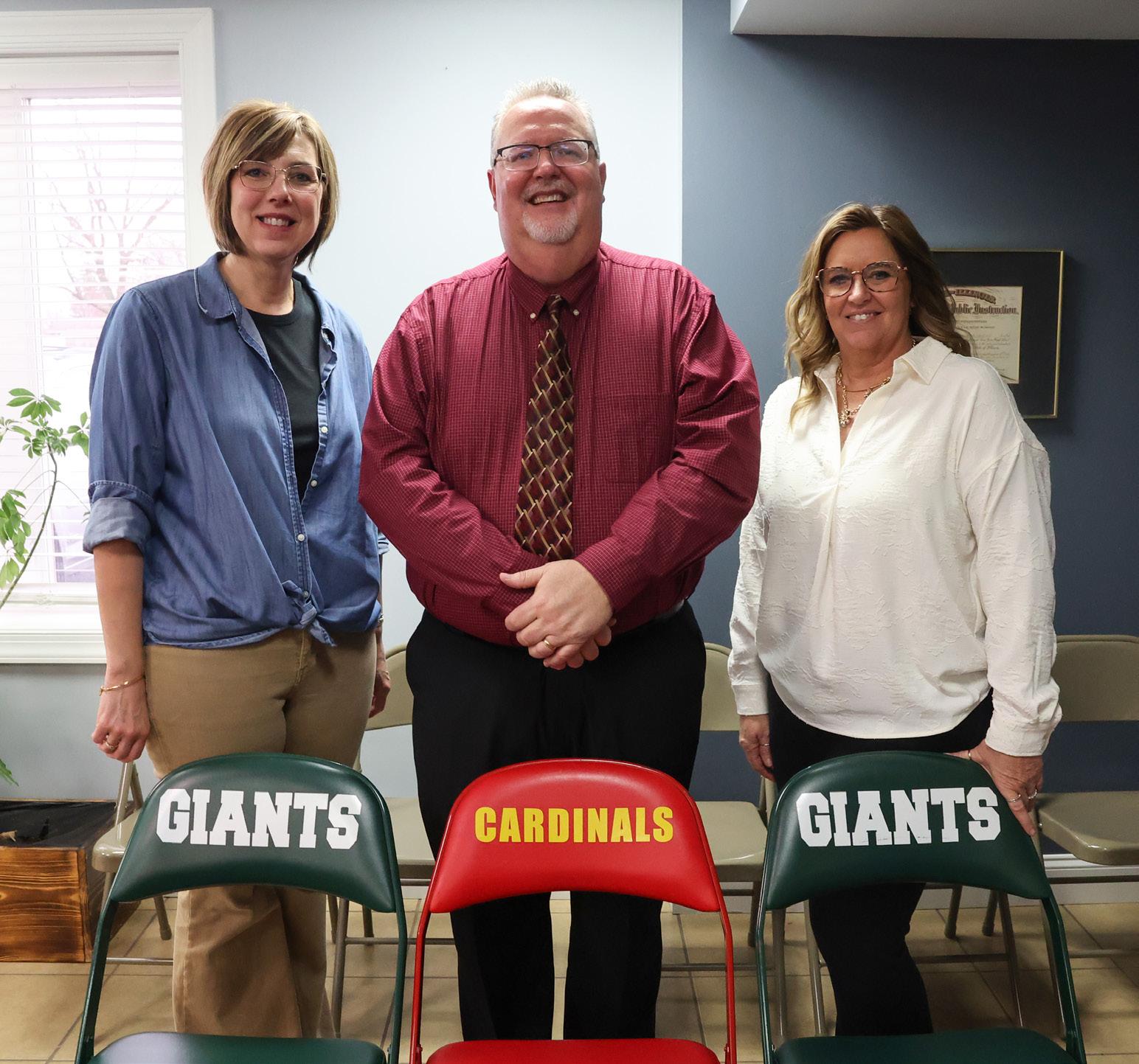 St. Anne Unit District 24 superintendent Charles Stegall (center) stands with office staff members Jill Cowsert (left) and Lisa Stalnecker at the school’s administrative office with chairs displaying the grade school and high school mascots, the Giants and Cardinals, respectively.