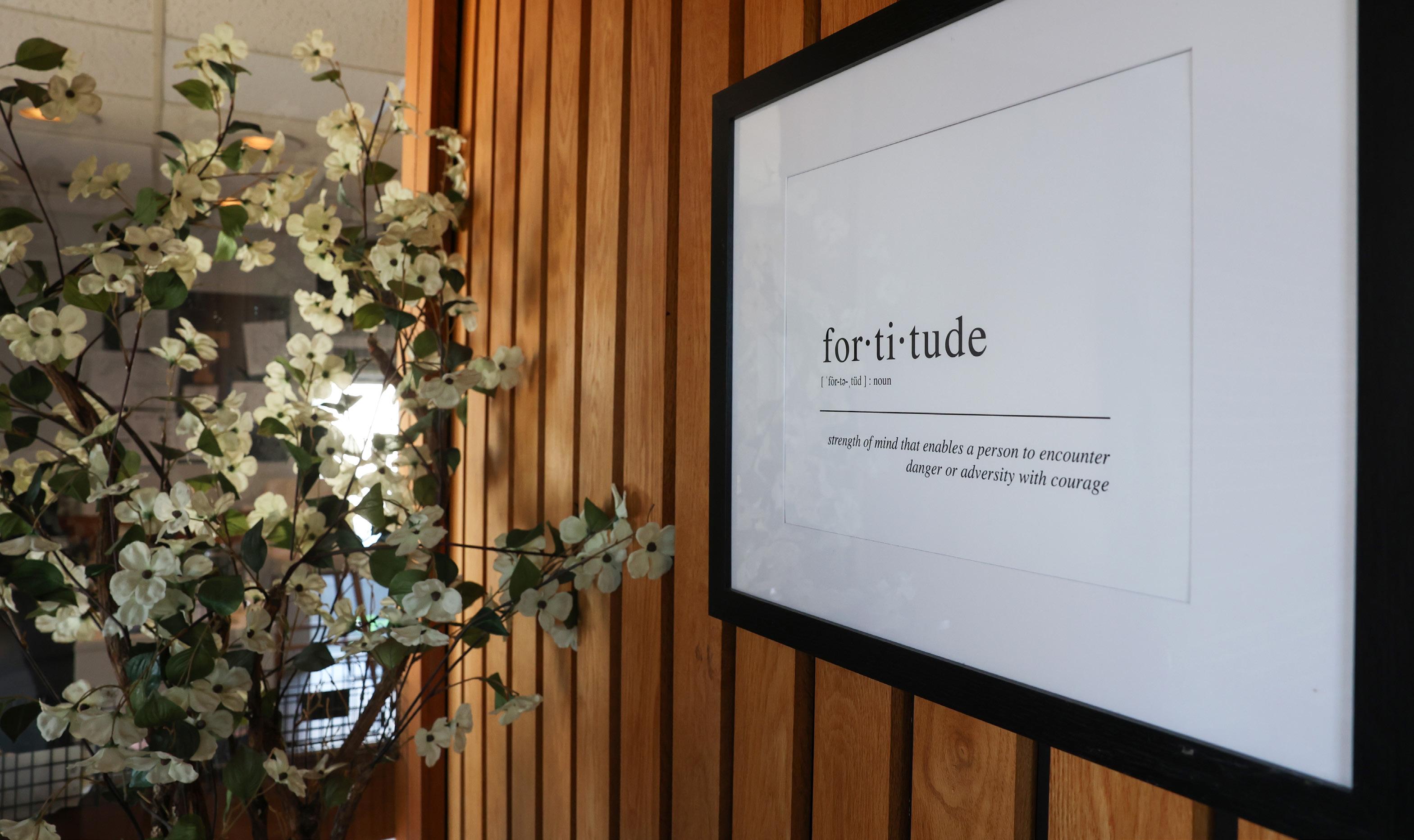 A sign defines the word “fortitude” outside the offices for Fortitude Community Outreach at its new location in East Kankakee.