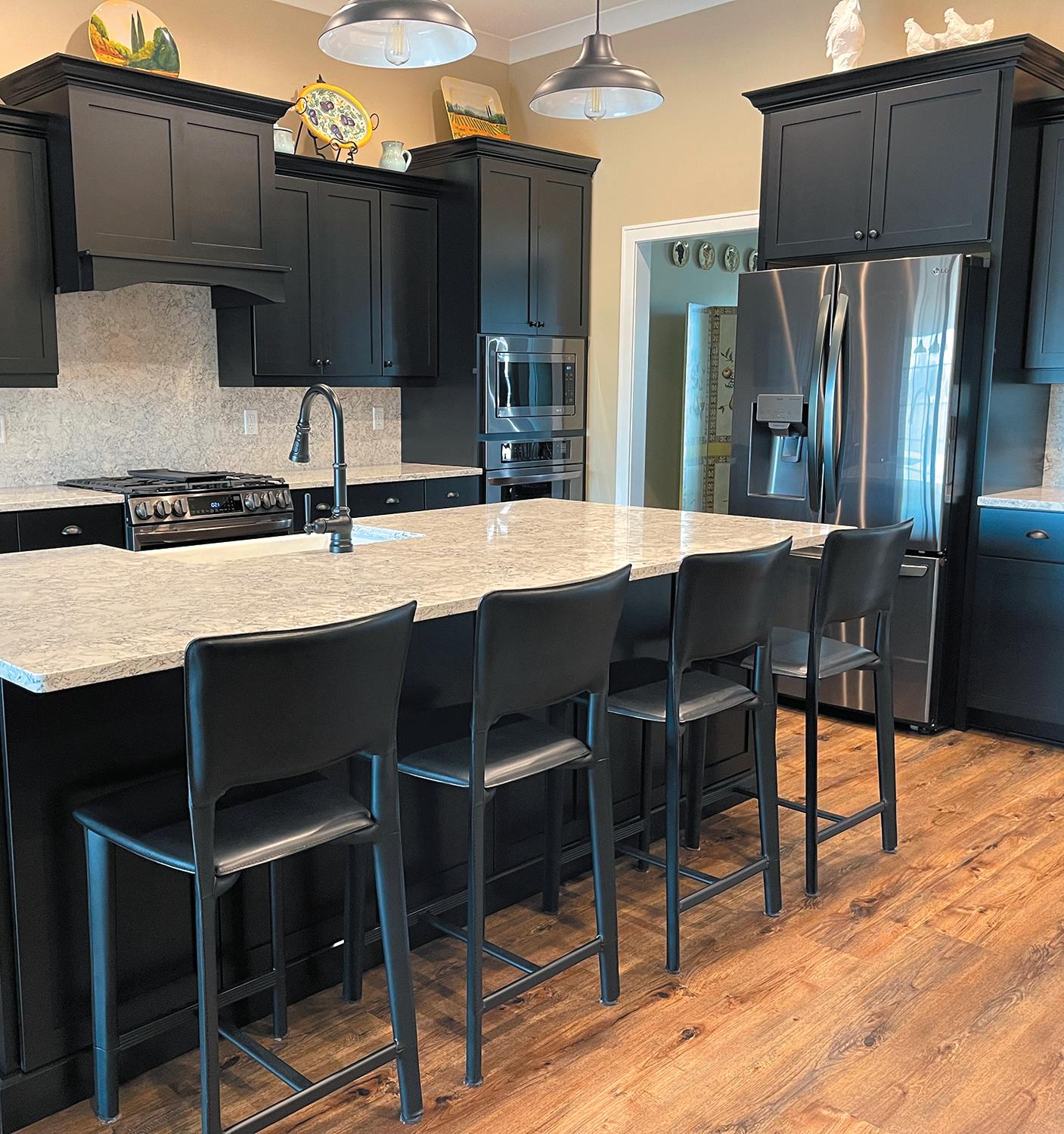 The Bradys’ new kitchen features WoodHarbor cabinets with the Madison door style in a Black Enamel finish, Cambria Quartz countertops in the Pendle Hill color, Scubaseal LVT flooring in the Pebble Beach color, Vent-A-Hood liner over the cooktop.