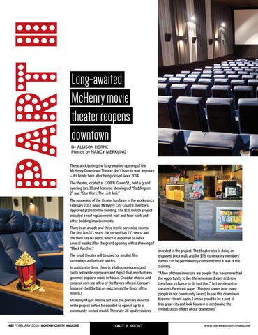 Long-awaited McHenry movie theater reopens downtown By ALLISON HORNE Photos by NANCY MERKLING Those anticipating the long-awaited opening of the McHenry Downtown Theater don’t have to wait anymore – it’s finally here after being closed since 2014. The theater, located at 1208 N. Green St., held a grand opening Jan. 18 and featured showings of “Paddington 2” and “Star Wars: The Last Jedi.” The reopening of the theater has been in the works since February 2017, when McHenry City Council members approved plans for the building. The $1.5 million project included a roof replacement, wall and floor work and other building improvements. There is an arcade and three movie screening rooms: The first has 113 seats; the second has 133 seats; and the third has 60 seats, which is expected to debut several weeks after the grand opening with a showing of “Black Panther.” The small theater will be used for smaller film screenings and private parties. In addition to films, there is a full concession stand (with bottomless popcorn and Pepsi) that also features gourmet popcorn made in-house. Cheddar cheese and caramel corn are a few of the flavors offered. (January featured cheddar bacon popcorn as the flavor of the month.) McHenry Mayor Wayne Jett was the primary investor in the project before he decided to open it up to a community-owned model. There are 28 local residents