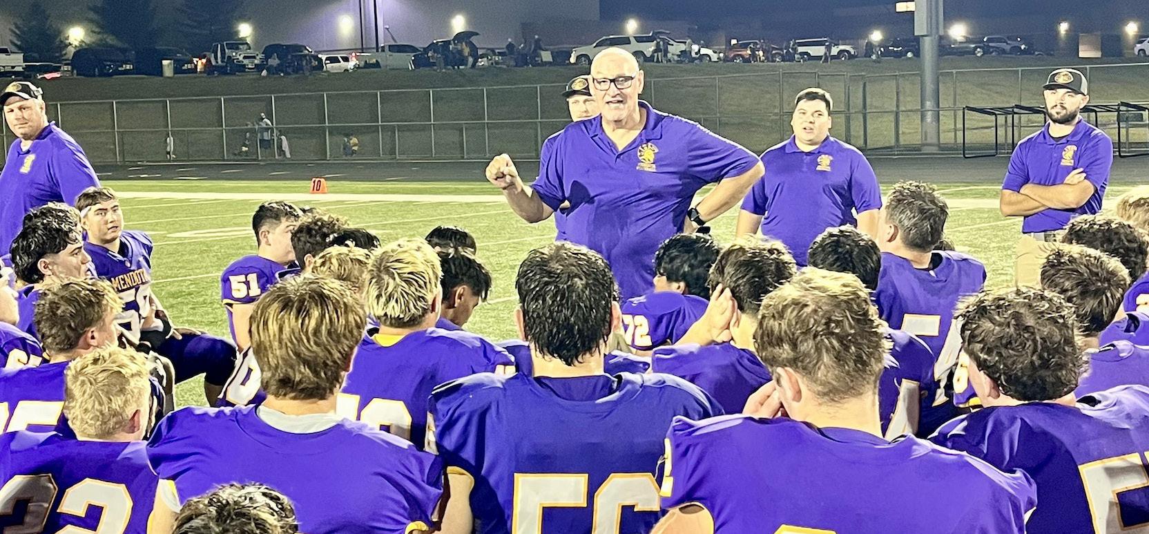 Mendota football coach Jim Eustice talks to his team after the Trojans beat Kewanee 45-13 on Friday, Oct. 3, in Mendota.