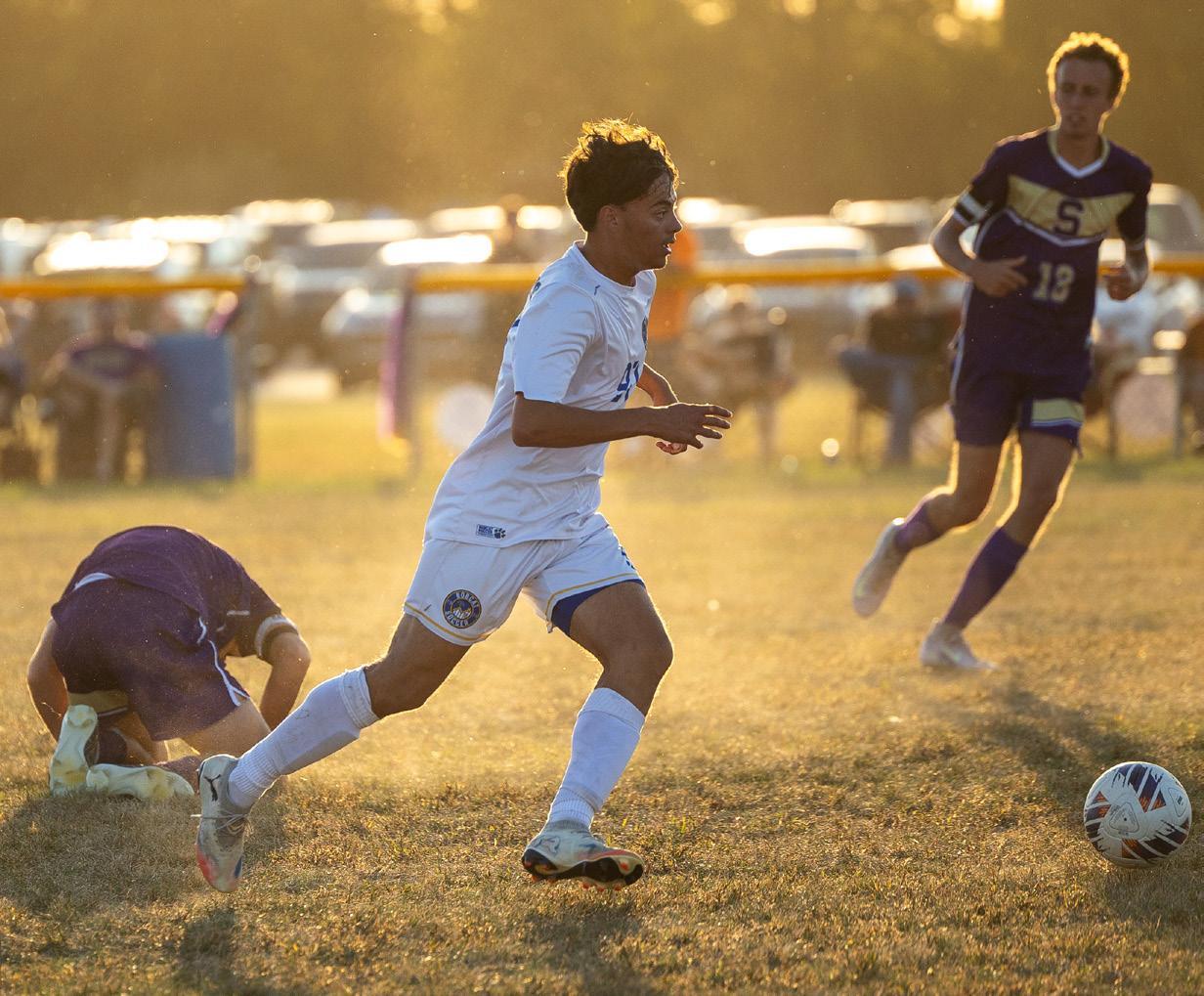 Mendota’s Alex Beetz kicks the ball up the field during the Three Rivers Tournament on Thursday, Oct. 2, at Mendota High School.