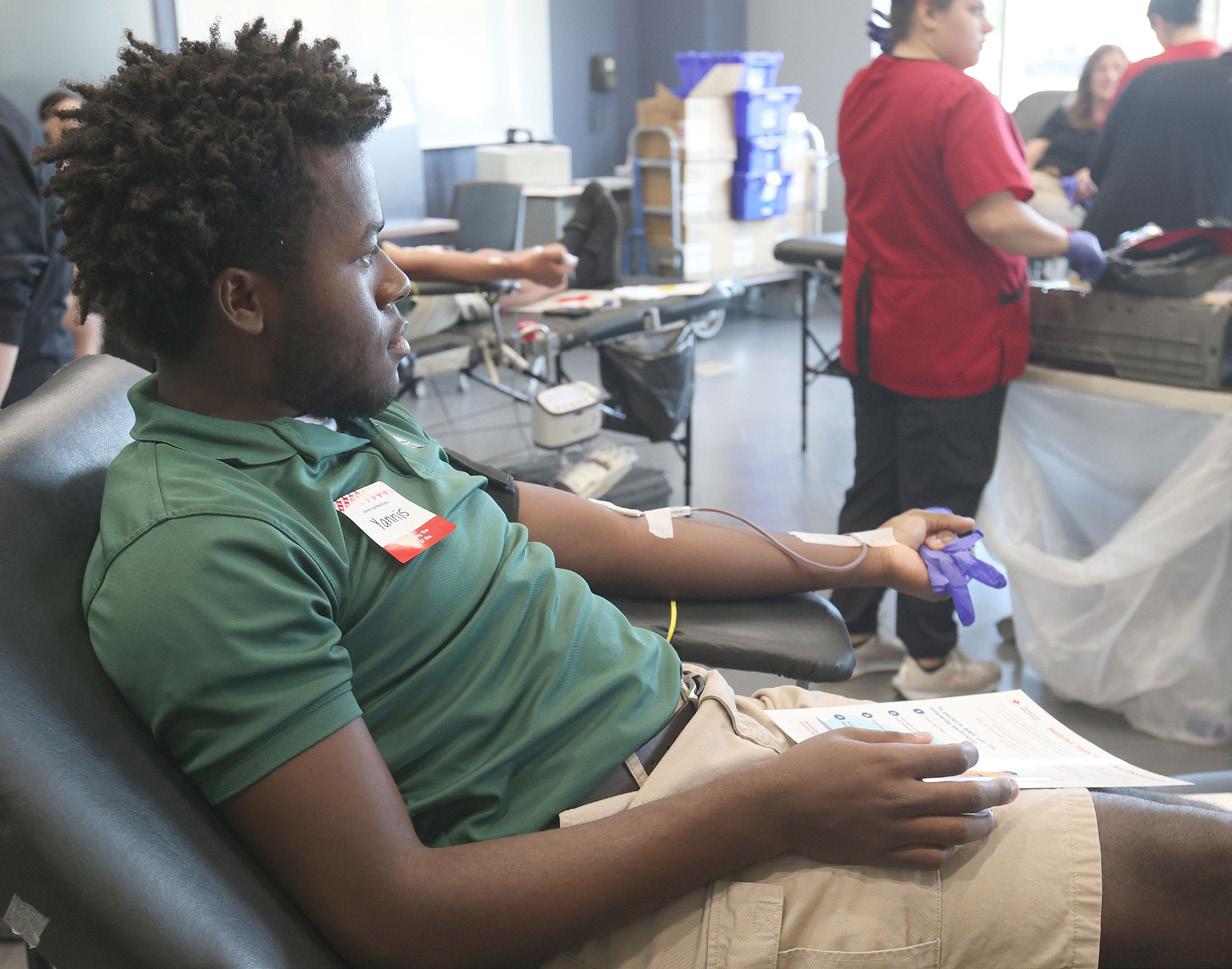 TOP LEFT: Yannis Yong has his blood drawn Nov. 4 during the St. Bede Community Blood Drive in the Perino Science Center at St. Bede Academy. TOP RIGHT: Gavin Gillan has his blood drawn Nov. 4 during the St. Bede Community Blood Drive in the Perino Science Center at St. Bede Academy. The school’s goal was to collect 100 pints this school year. ABOVE: William Sramek has his blood drawn Nov. 4 during the St. Bede Community Blood Drive in the Perino Science Center at St. Bede Academy. If the school reaches its goal, the Red Cross will award a $1,000 scholarship to one graduating senior. LEFT: Chris Gedraitis gives blood Nov. 4 with the help of American Red Cross’ Katie Scheid during the St. Bede Community Blood Drive in the Perino Science Center at St. Bede Academy.