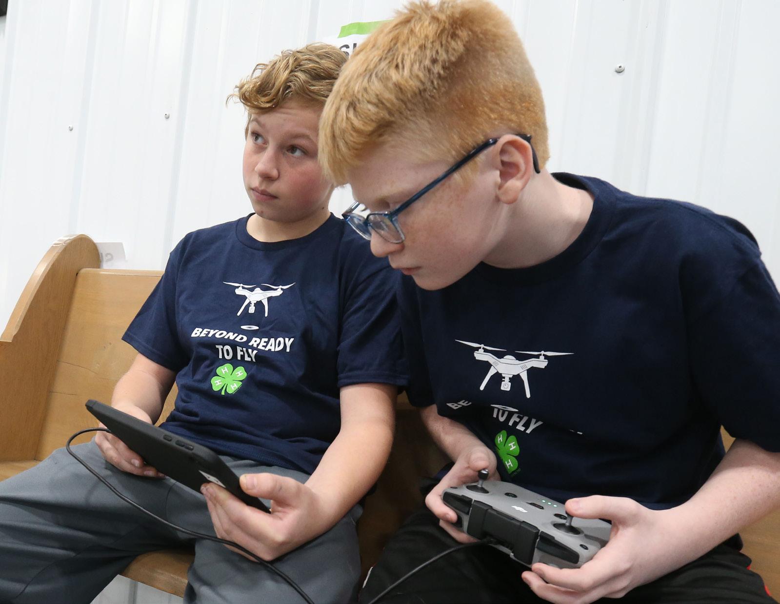 LEFT: University of Illinois Extension 4-H Youth Development educator Shasta Hladovcak speaks Saturday during a drone competition at the Second Story Teen Center in Princeton. TOP RIGHT: Peter and Joseph Martin of Ottawa watch a drone fly over their heads Saturday during a drone competition at the Second Story Teen Center in Princeton. Teams from Bureau, La Salle and Marshall-Putnam counties came together to showcase their flying skills during a drone competition at the Second Story Teen Center in Princeton. ABOVE: Noah Mollin and Pierce Hubbard, both of Princeton, fly their drone through and around obstacles Saturday during a drone competition at the Second Story Teen Center in Princeton. The teen center partnered with the University of Illinois Extension of Bureau, La Salle Marshall and Putnam counties. LEFT: Several DJI drones take a break from their flights Saturday during the drone competition at the Second Story Teen Center in Princeton. The drones and awards were bought through a grant and donations from Compeer Financial.