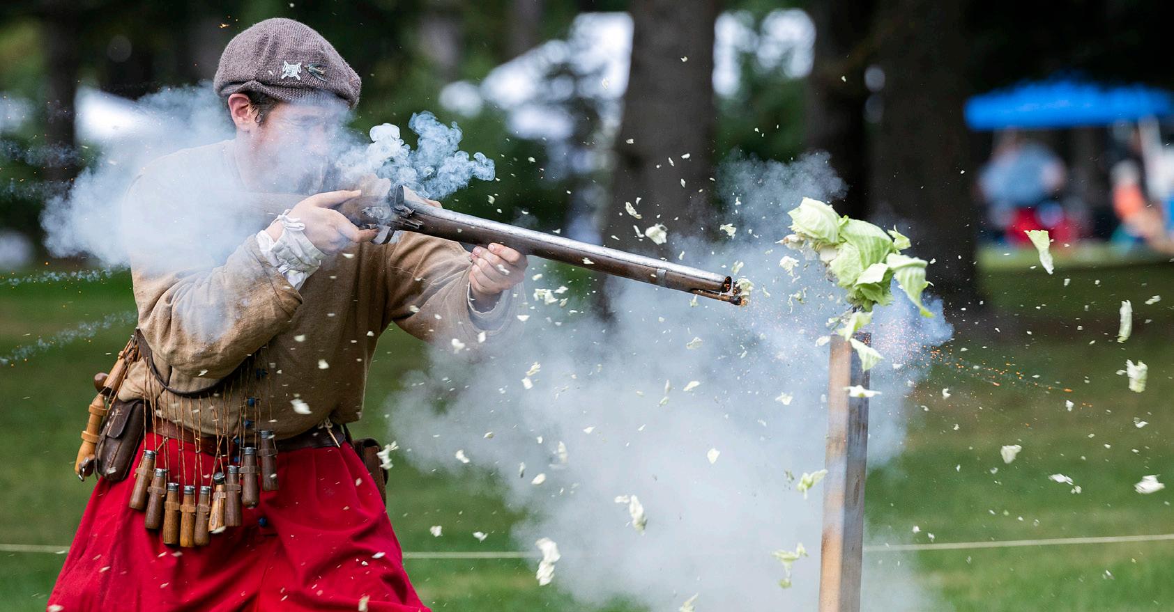Elizabethan history educator Andy Montano blasts apart a head of cabbage Saturday, Sept. 21, 2024, during a demonstration of early rifle technology at Fall and Fantasy Fest. The group could not shoot live ammo but still wanted to show the power of early armaments.