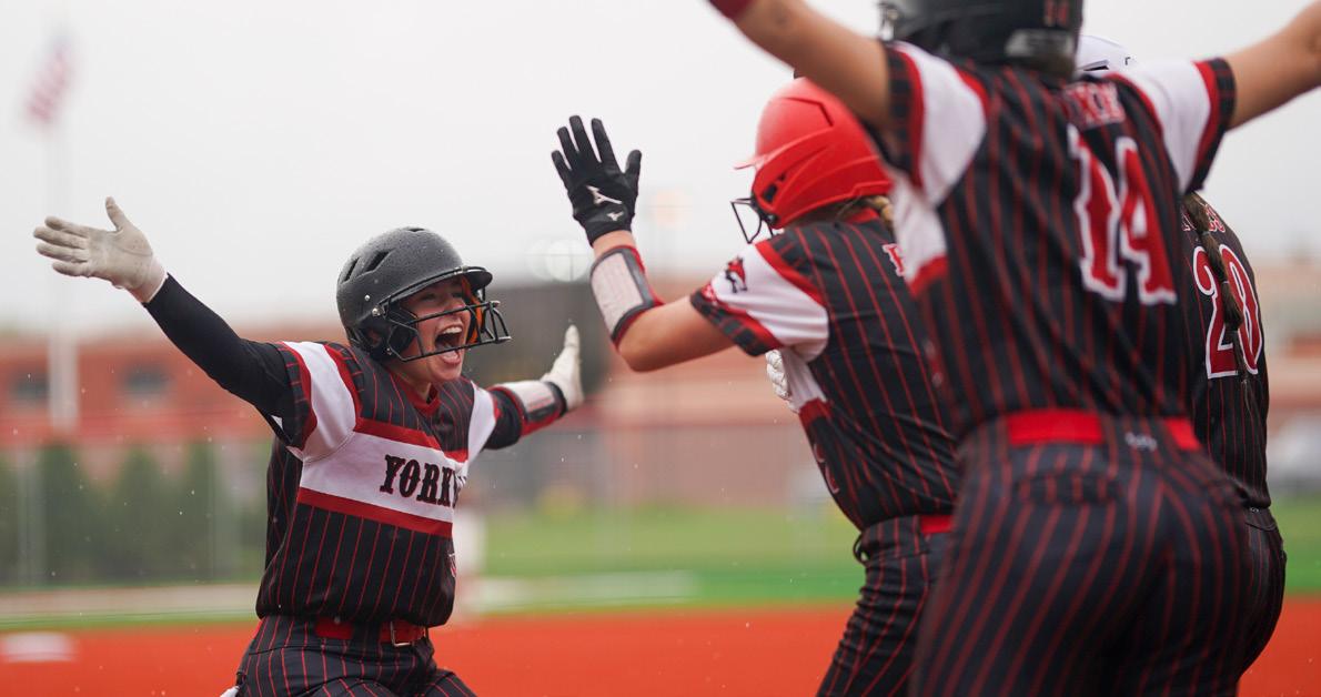 Sean King for Shaw Local News Network Yorkville’s Regan Bishop (left) reacts after crossing the plate to score a run against Oswego during a softball game at Yorkville High School on Thursday, May 9, 2024.
