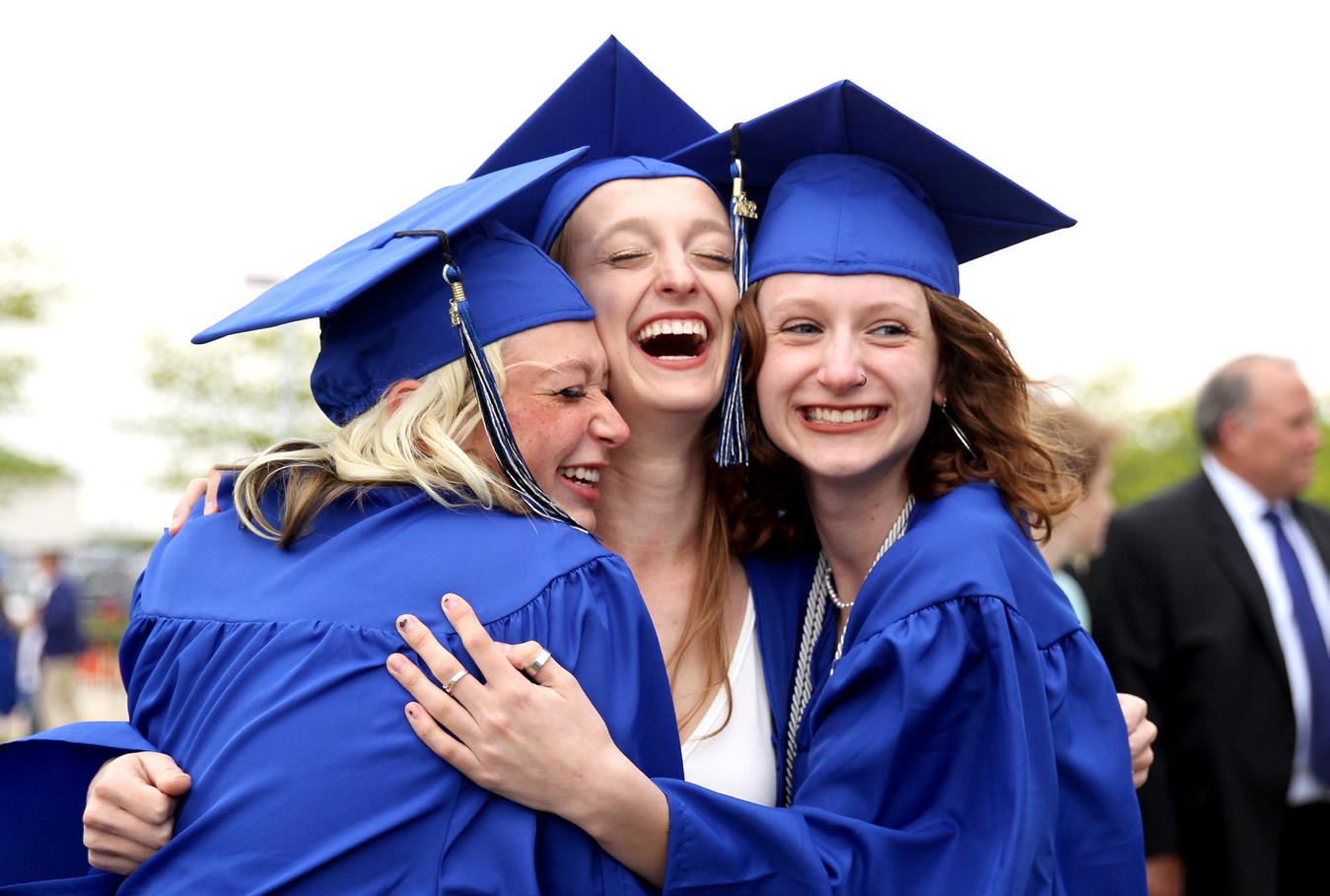 (Left to right) St. Charles North graduates Morgan Zyrek, Maddy Gaber and Makenzie Thomas pose for a photo before the school’s commencement ceremony at the Northern Illinois Uni versity Convocation Center in DeKalb on Monday, May 23, 2022.