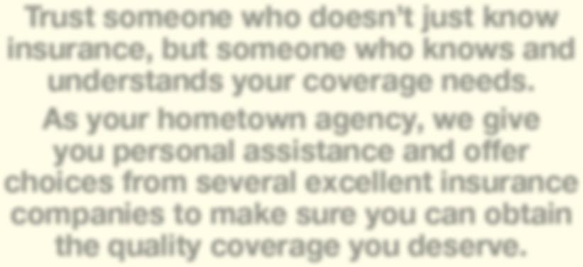 Trust someone who doesn’t just know insurance, but someone who knows and understands your coverage needs. As your hometown agency, we give you personal assistance and offer choices from several excellent insurance companies to make sure you can obtain the quality coverage you deserve.
