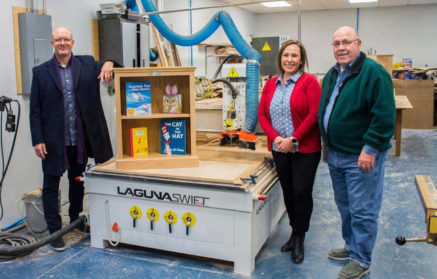 Bookcase Project Steering Committee member Mark Mattson (left), Teri Spartz and John Rey stand next to a completed bookcase in 2022.