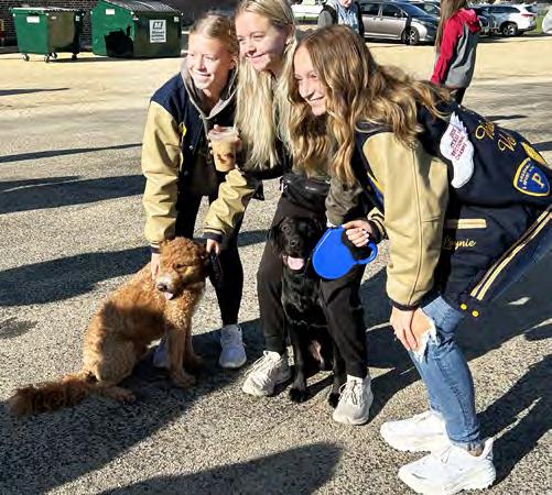 Carlee Grobe, Grace Miatke and Laynie Mandrell pose for a photo with Harley and Max at the Doggy Dash on Saturday, Sept. 6. The event, organized by the Polo Student Council, raised money for a local animal shelter.