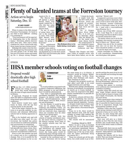 COMMENTARY Andy Colbert can. To avoid problems associated with a school’s conference affiliation, the IHSA proposal is cut and dried in how it would be administered. Your team is geographically and enrollment classified. For example, Oregon’s 3A district could include Byron, Erie-Prophetstown, Hall, North Boone, Peru St. Bede, Princeton and Winnebago. For the Hawks, it would be plus. Gone are 4A schools Dixon, G-K, Lutheran and Stillman Valley. All eight of the schools in Oregon’s district are relatively close, especially when one considers how far other districts are spread apart. For larger schools with few schools of similar enrollment nearby, the travel will be a negative to the district concept. Even some of the smaller schools may feel the same pinch. In a sample set-up for 2A, Amboy and Pecatonica are aligned with Chicago schools. Besides the long travel, the home gates would be reduced because Chicago teams are notoriously bad for road attendance. Located in the northwest part of the state, Forreston will be seeing