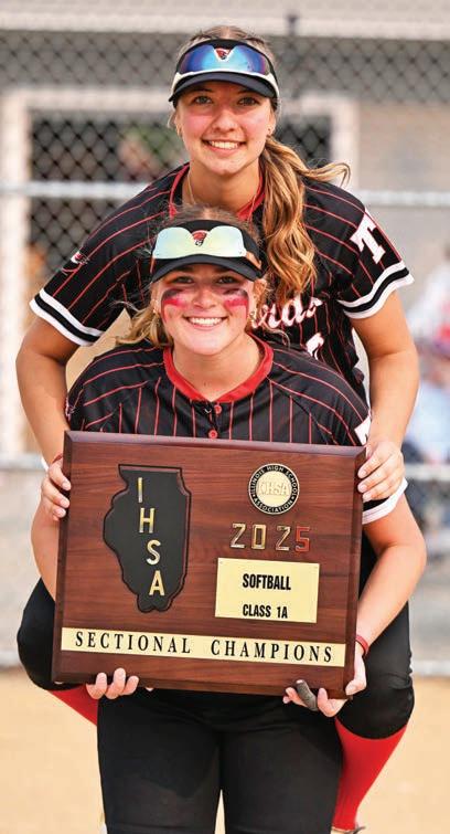 CONTRIBUTED PHOTOS/MELISSA THOMPSON Brooklynn Thompson holds the plaque her Henry-Senachwine High School softball team earned for being sectional champions in 2025, while teammate Rachel Eckert jumps on her back for a picture.