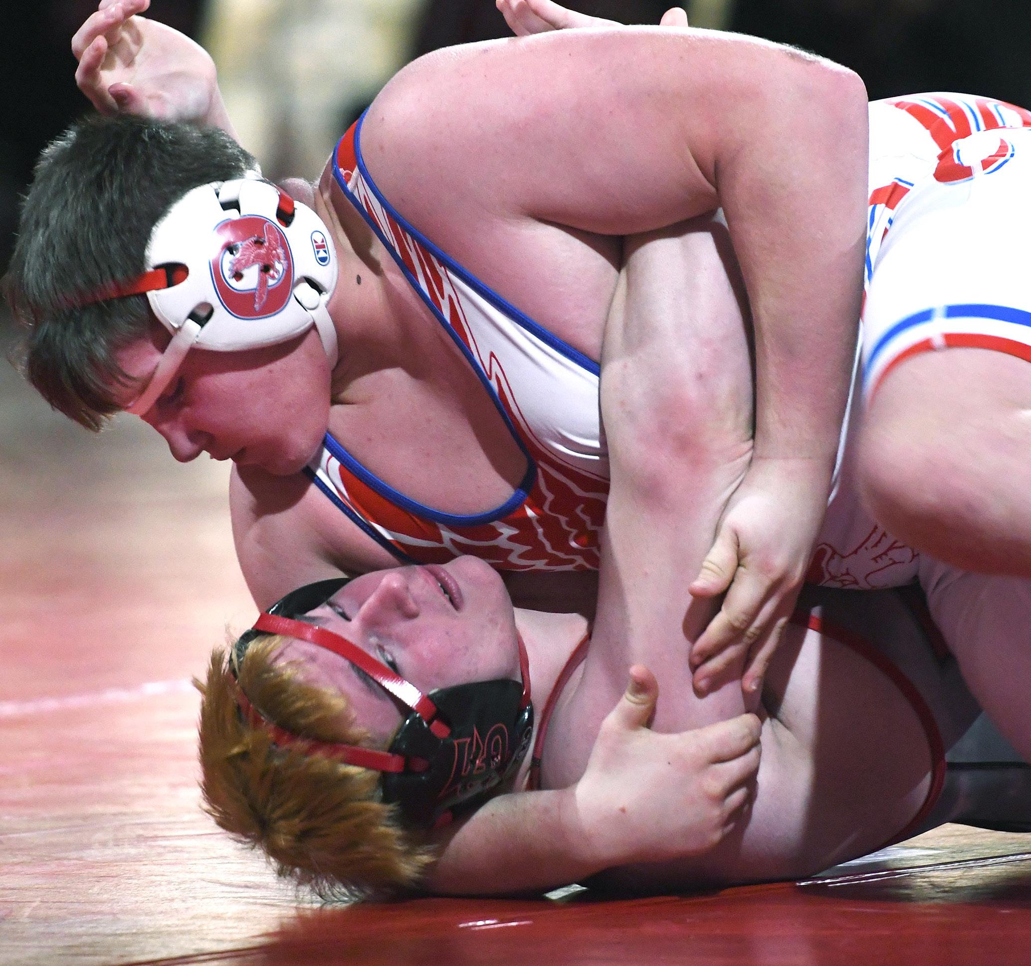 Oregon’s Jacksyn Windam holds Fulton’s Christian Mitchell on the mat during the 215-pound match on Dec. 4 at Oregon High School.