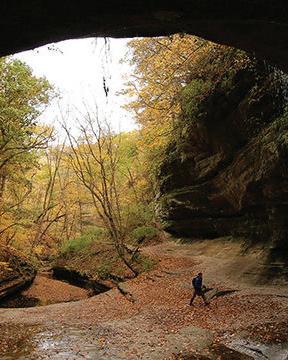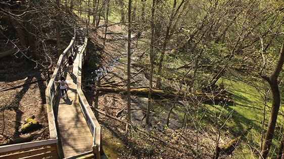 Along the meandering banks of Spring and Pine creeks, this scenic haven has magnificent trees that share moss-covered cliffs, strung with trailing vines. In season, colorful beds of blossoming trout lilies, solomons seals, bloodroot, blue-eyed grass, spring beauty and hepatica are everywhere.