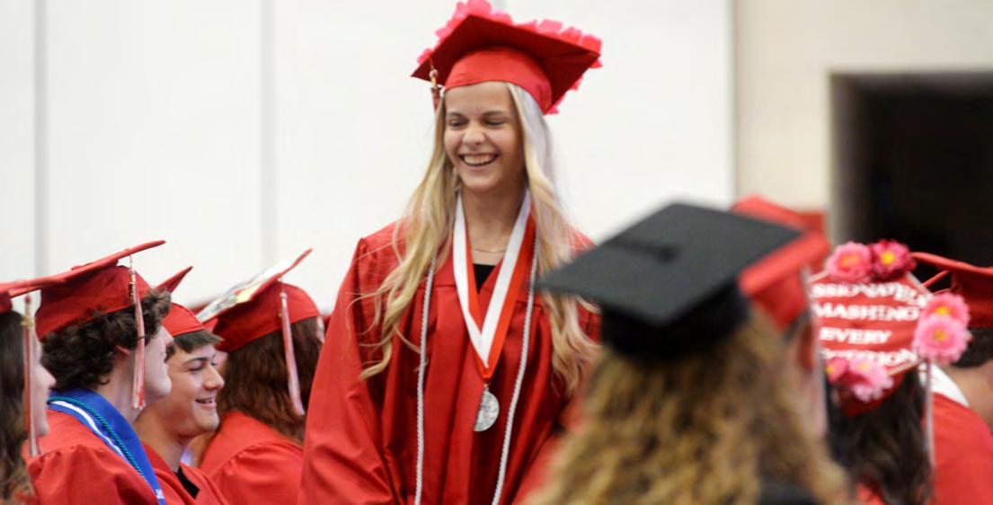 ABOVE: Gabriele Hoyle smiles as she goes back to sit with her classmates after giving one of the senior reflections at Oregon High School’s Class of 2025 commencement May 18.