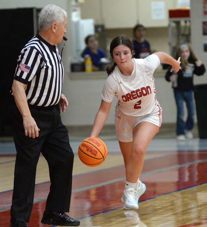 Oregon’s Avery Kitzmiller dribbles up the court against West Carroll on Nov. 20 at the Oregon Girls Basketball Tip-Off Tournament at the Blackhawk Center in Oregon.