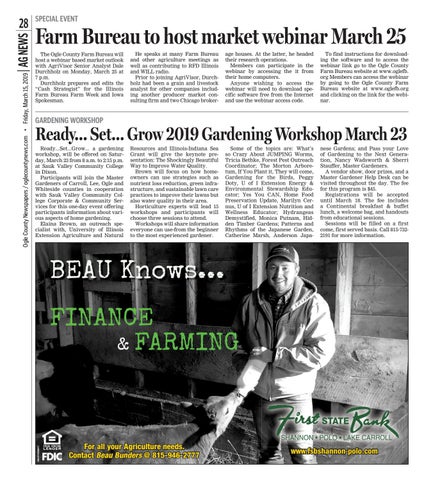 Farm Bureau to host market webinar March 25 The Ogle County Farm Bureau will host a webinar based market outlook with AgriVisor Senior Analyst Dale Durchholz on Monday, March 25 at 7 p.m. Durchholz prepares and edits the “Cash Strategist” for the Illinois Farm Bureau Farm Week and Iowa Spokesman.
