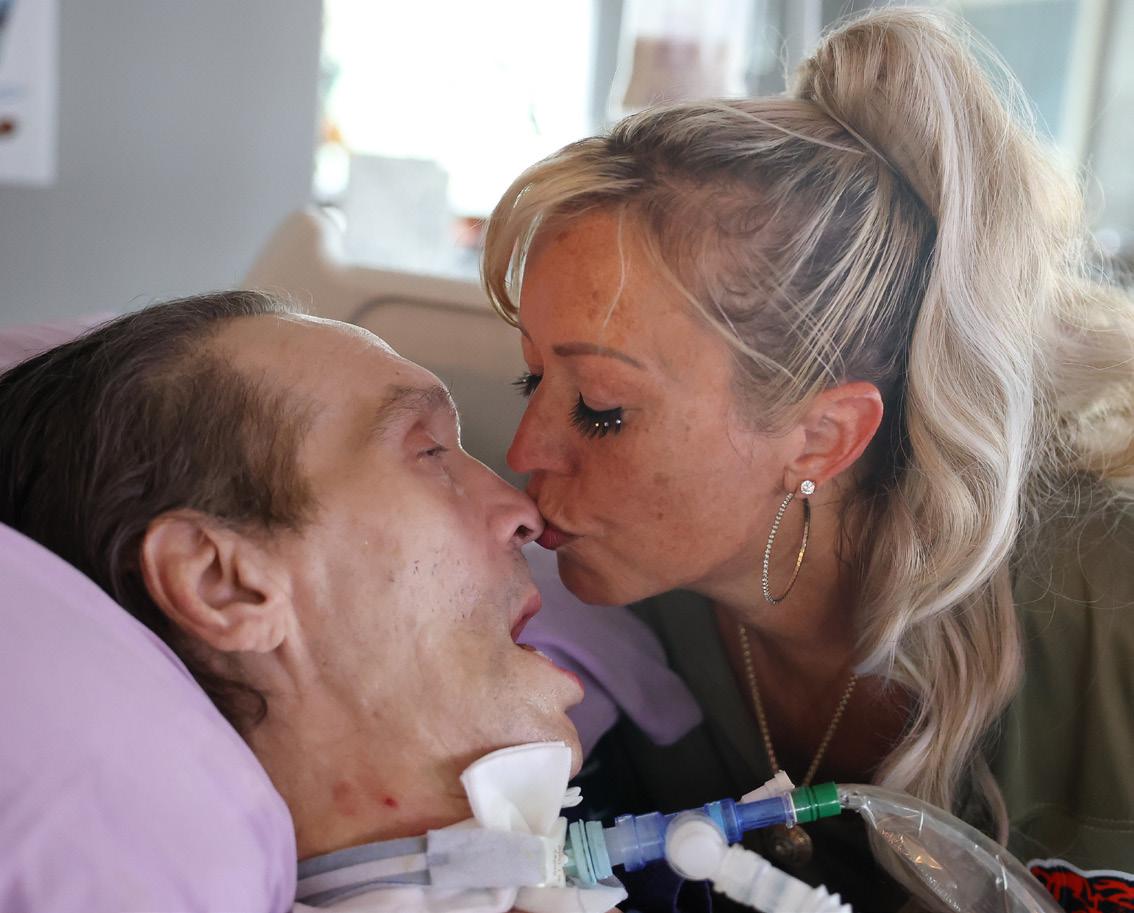 Steve McMichael gets a kiss on the nose from his wife Misty at the McMichael’s home on Tuesday, July 30, 2024. Steve will be inducted into the NFL Hall of Fame on Saturday, August 1st.