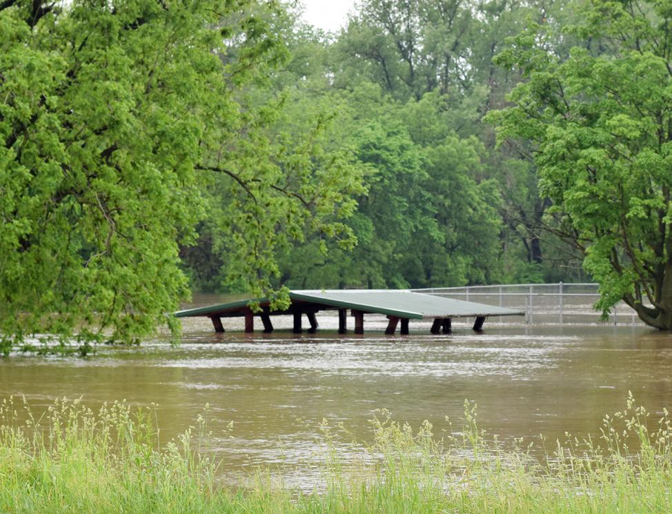 the roof of the shelter in Holmdahl Park can be seen during the May 21 floods in Kellogg. A month after the president issued a disaster order for a number of Iowa counties affected by storm damage and floods, Jasper County and two other counties were added to the declaration.