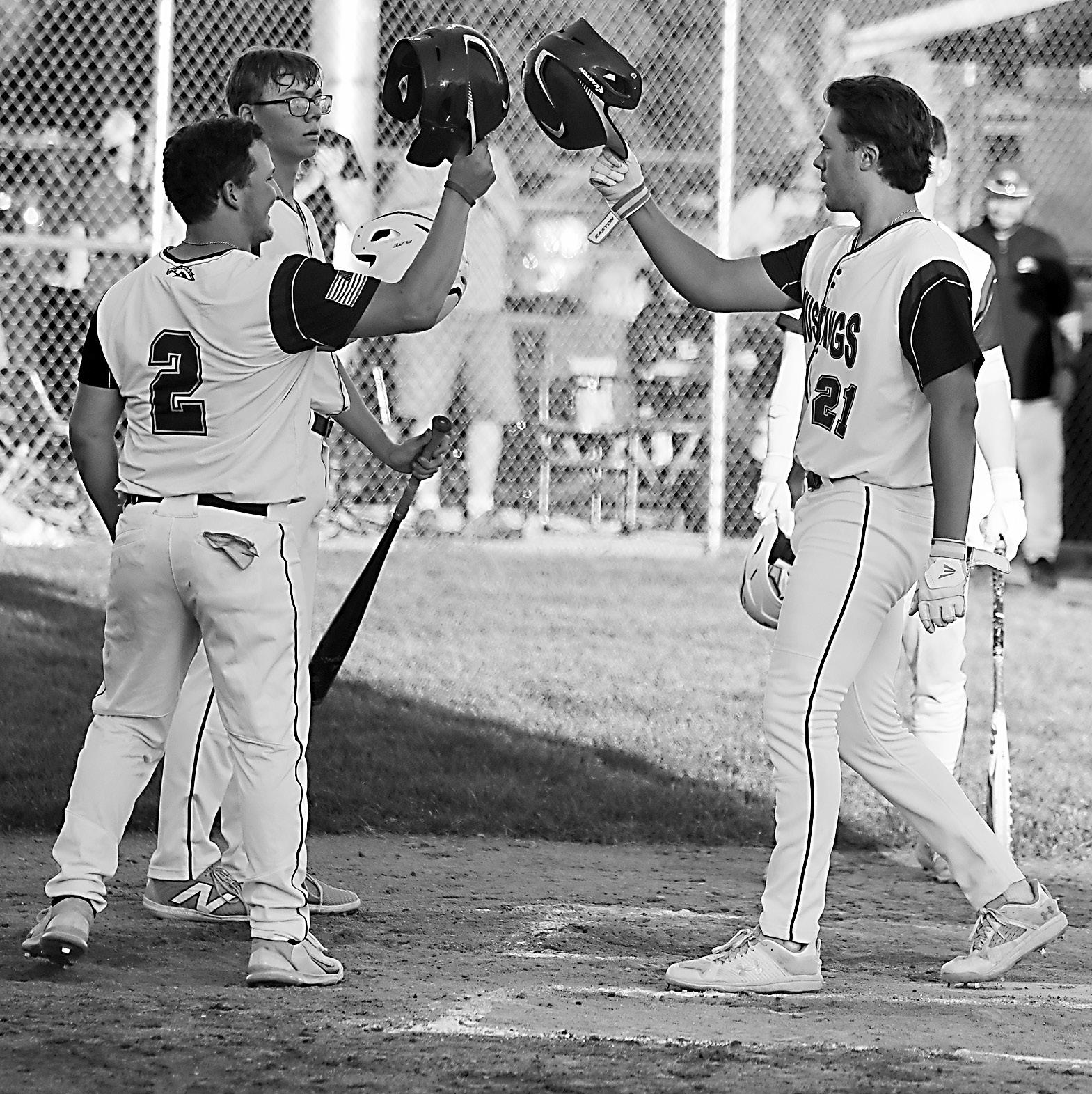 PCM senior Easton Webb, right, celebrates a home run with junior Kaleb DeVries (2) and senior Nick Farver during the Mustangs’ 10-0 win over Nevada on June 26. Farver and DeVries were on base for both of Webb’s three-run dingers in the game.