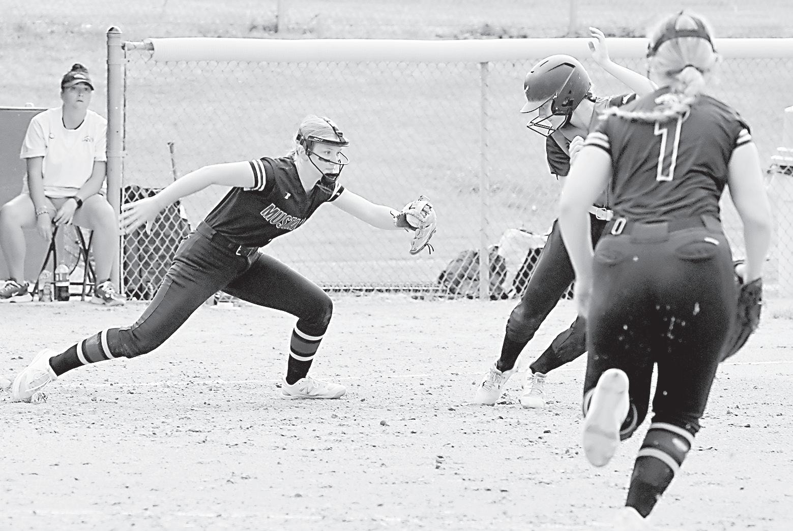 Addi Hudnut, left, tags out a BCLUW runner who was caught in a run down during their game on June 27. The Mustangs scored twice in the sixth inning and downed the Comets 2-0.