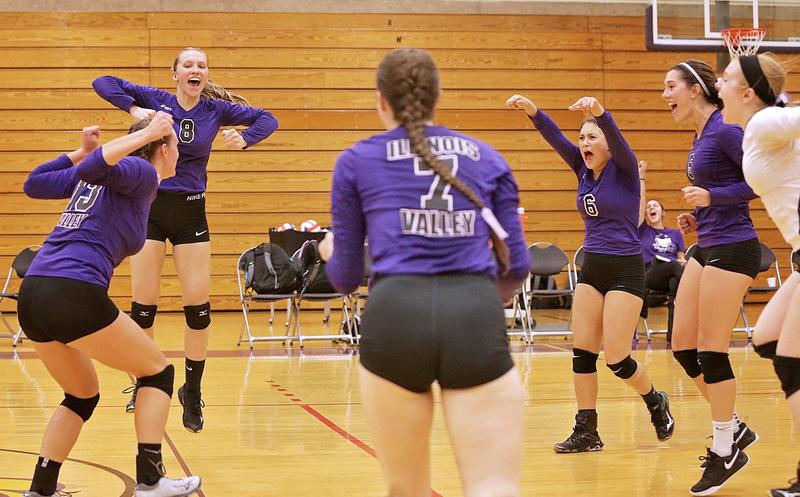 Members of the IVCC volleyball team celebrate during their 23-25, 25-18, 25-20, 25-11 victory over Kishwaukee in an Arrowhead Conference match Wednesday in Oglesby. The Eagles improved to 4-2 overall and 2-0 in the conference.