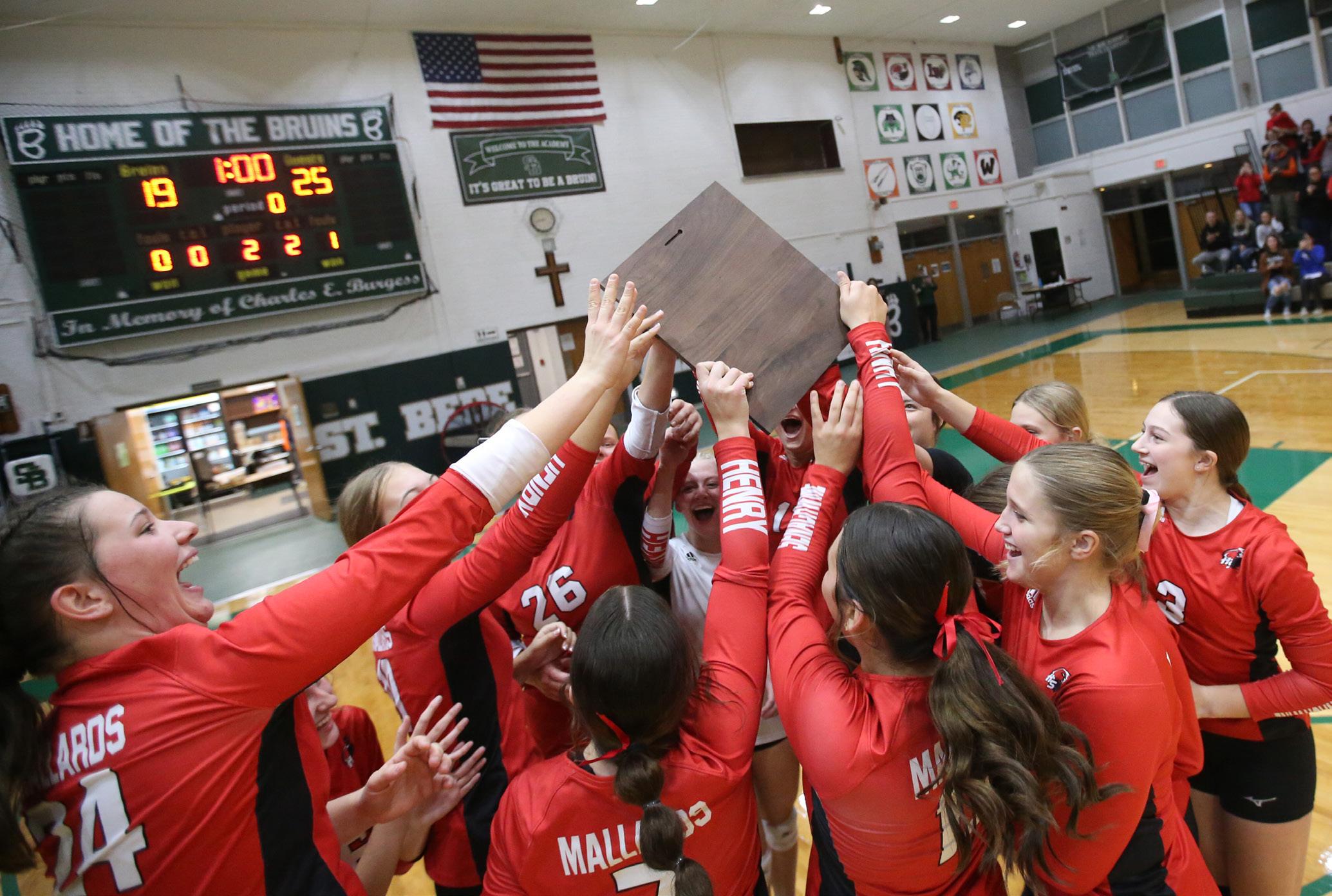 Members of the Henry-Senachwine volleyball team hoist the Class 1A regional plaque after defeating St. Bede on Thursday at St. Bede Academy. The Mallards advanced to next week’s Williamsfield Sectional.
