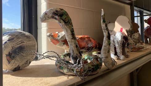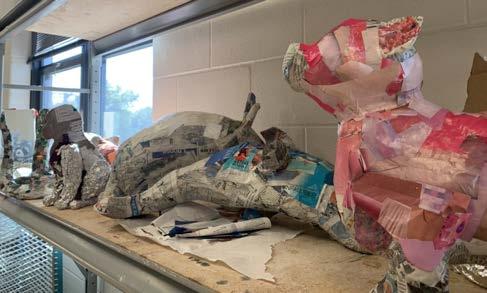Students in Leah Kuhn’s 3D design class start to work on animal sculptures. With the same approach as artist Will Kurtz, the students are surfacing the sculptures with newspaper.