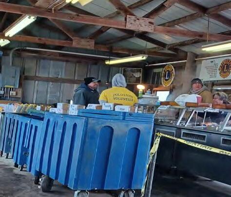 On Saturday, April 1, the Polo Lions Club operated its concession stand at the annual Hazelhurst Spring Consignment Sale. The menu included pork chop sandwiches, hamburgers, cheeseburgers, brats, hot dogs, chips, candy, pop, water, coffee, hot cocoa, gatorade and iced tea. The temperature was in the 40s but the Lions Club overcame the inclement weather and had a successful day, selling out their sandwiches. Manning the grill were Mike Faivre and Lions members Keith Chesnut and Ben McKean. In the center photo are Ryan Shetler, Jon Mandrell, Winton Bocker, Irene Short and Judy Norris.