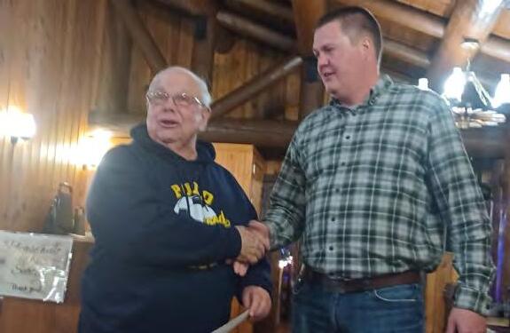 Photo provided by Jeff Short Polo Lions Club President Winton Bocker presented Larry Loomis with a donation of $350 for Polo Youth Softball. The donation was made at the Lions’ April 4 meeting at White Pines Lodge.