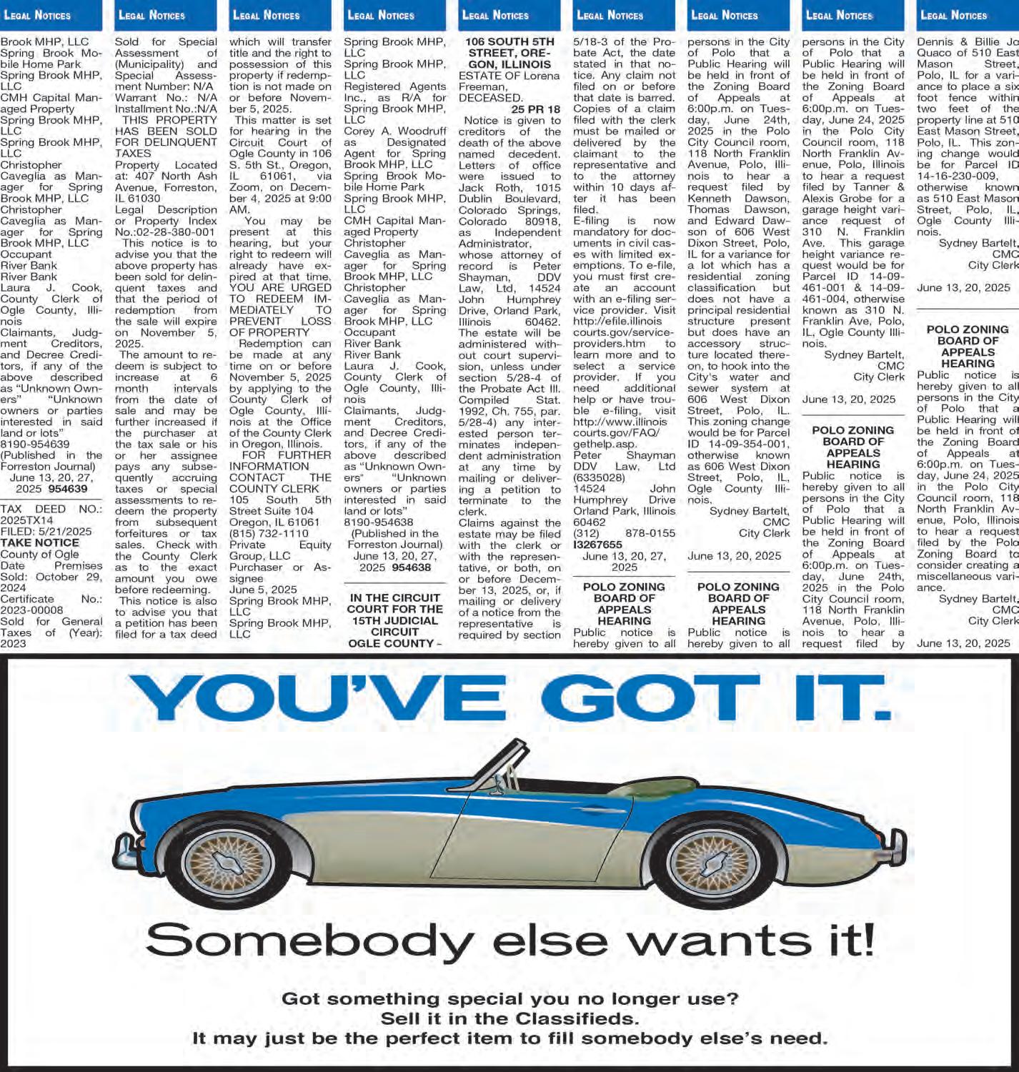CASE NUMBER: 2025TX22 Dennis Mumford; Debbbi Mumford; City of Polo; Occupants; Ogle County Clerk; Claimants, Judgment Creditors and Decree Creditors, if any of the above described as “unknown owners” “Unknown owners or parties interested in said land or lots” June 20, 27, July 4, 2025