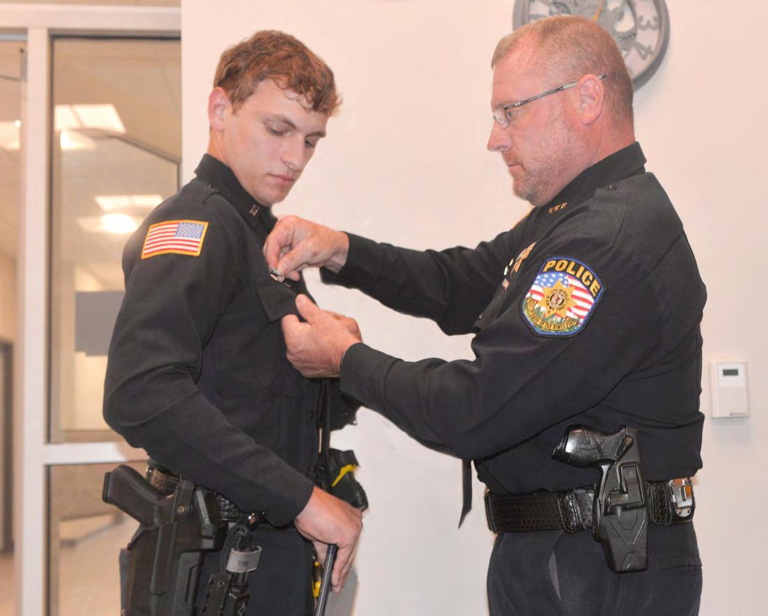 Polo patrol officer Kaden Coppotelli (left) receives an ILACP Lifesaving Award pin from Polo police chief Matt Coppotelli on July 7 during the Polo City Council meeting. Matt is Kaden’s father. Kaden received the honor for carrying an elderly Polo man from his home during a December 2024 fire. Story on