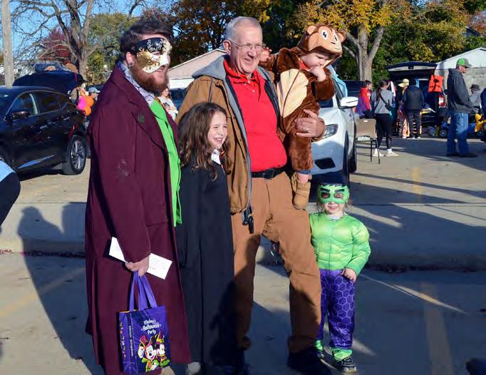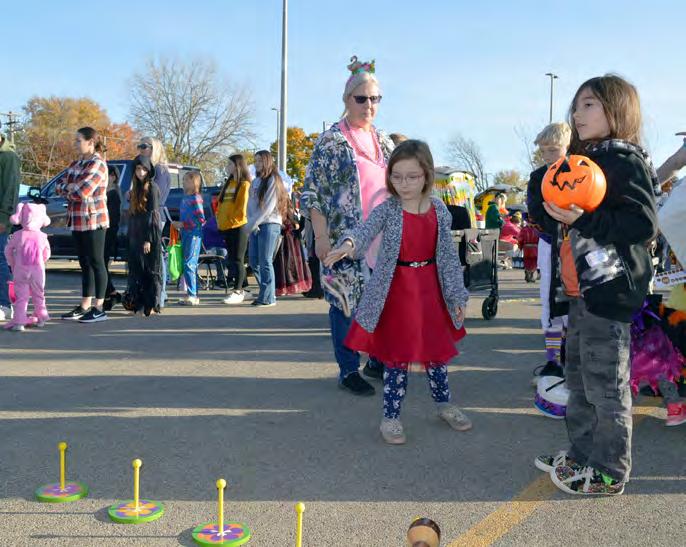 dressed as Uma from Disney’s “Descendants 2,” present their tickets to be punched and receive candy Oct. 26 at trunk-or-treat at Crossroads Community Church’s Polo campus. About 800 people attended the event. TOP RIGHT: Tammy Ludwig of Forreston holds 4-month-old Bensyn Engelbarts, who is dressed as a corncob, at the trunk-or-treat. ABOVE: Jenna Martz, 2, of Polo, twirls in her princess costume. LEFT: A family poses for a photo at trunk-or-treat. From left are Travis Fisher of Dixon, dressed as a phantom; Shiloh Haas, 9, dressed as Hermione Granger; David Dahl of Polo as himself; Asher Full, 1, dressed as a monkey; and Theo Fisher, 4, dressed as The Incredible Hulk. MIDDLE LEFT: Auralia Trahan, 7, of Polo throws a ring as part of a game while older brother James Trahan, 8, watches at the trunk-or-treat at Crossroads Community Church’s Polo campus.