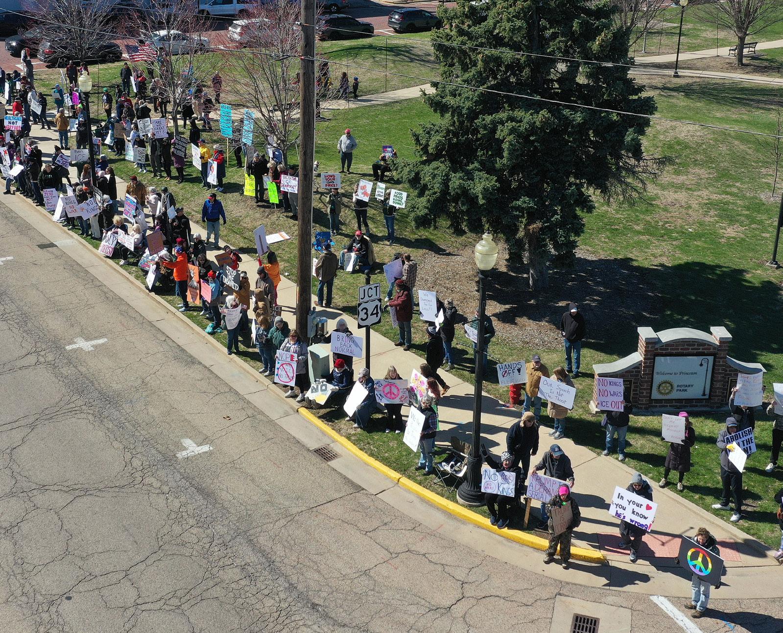TOP LEFT: Protesters gather for a No Kings rally on Saturday at Rotary Park in Princeton. TOP RIGHT: An aerial view of hundreds of protesters gathering for a No Kings rally on Saturday at Rotary Park in Princeton.