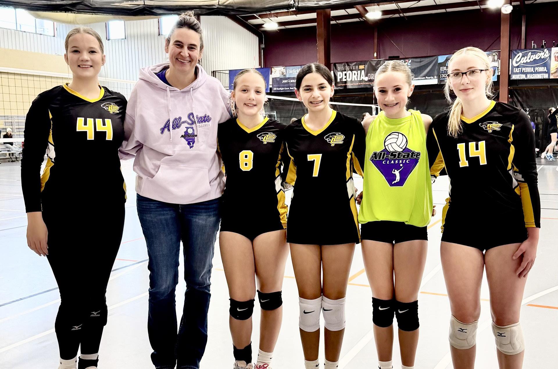 Coach Shannon Jenkins is joined by PCJH players Kinsey Pierski (from left) Lillian Bouxsein, Natalie Guadiana, Annie Judd and Jaylynn Dickey for the All-State Classic in East Peoria.