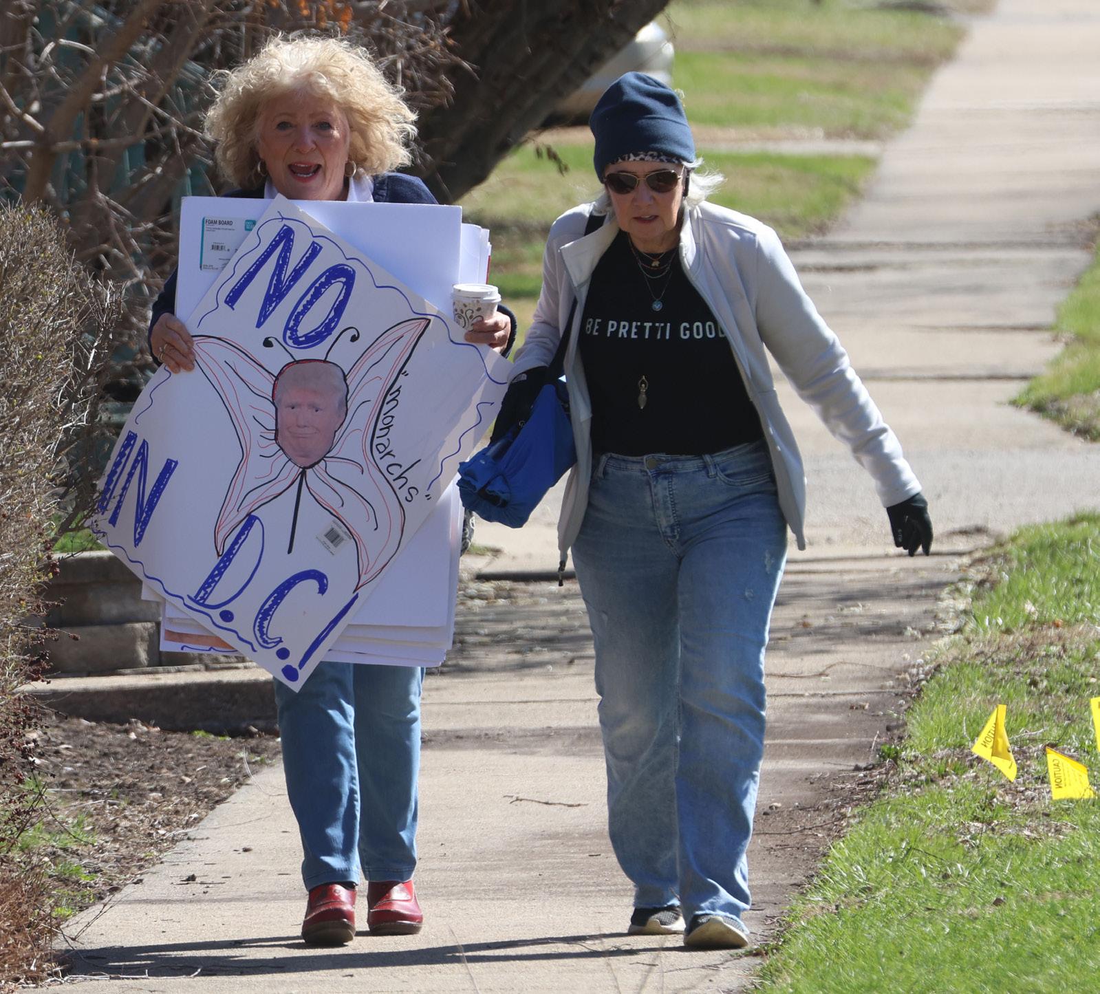 ABOVE: Protesters Mary Mickow and Marybeth Bouchard of Princeton walk to the No Kings rally.
