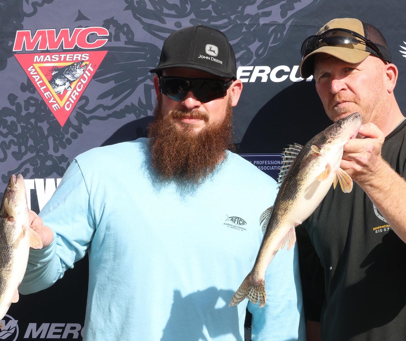 ABOVE: Eric Maggio of Ladd, holds his fish with his sons Owen and Grady, pose for a photo caught during the annual Masters Walleye Circuit tournament on March 20, at the Spring Valley Boat Club. LEFT: Tyler DeBernardi of Ottawa, and J.J. DeBernardi of Wayne, hold up their walleye during the annual Masters Walleye Circuit tournament on March 20, at the Spring Valley Boat Club.