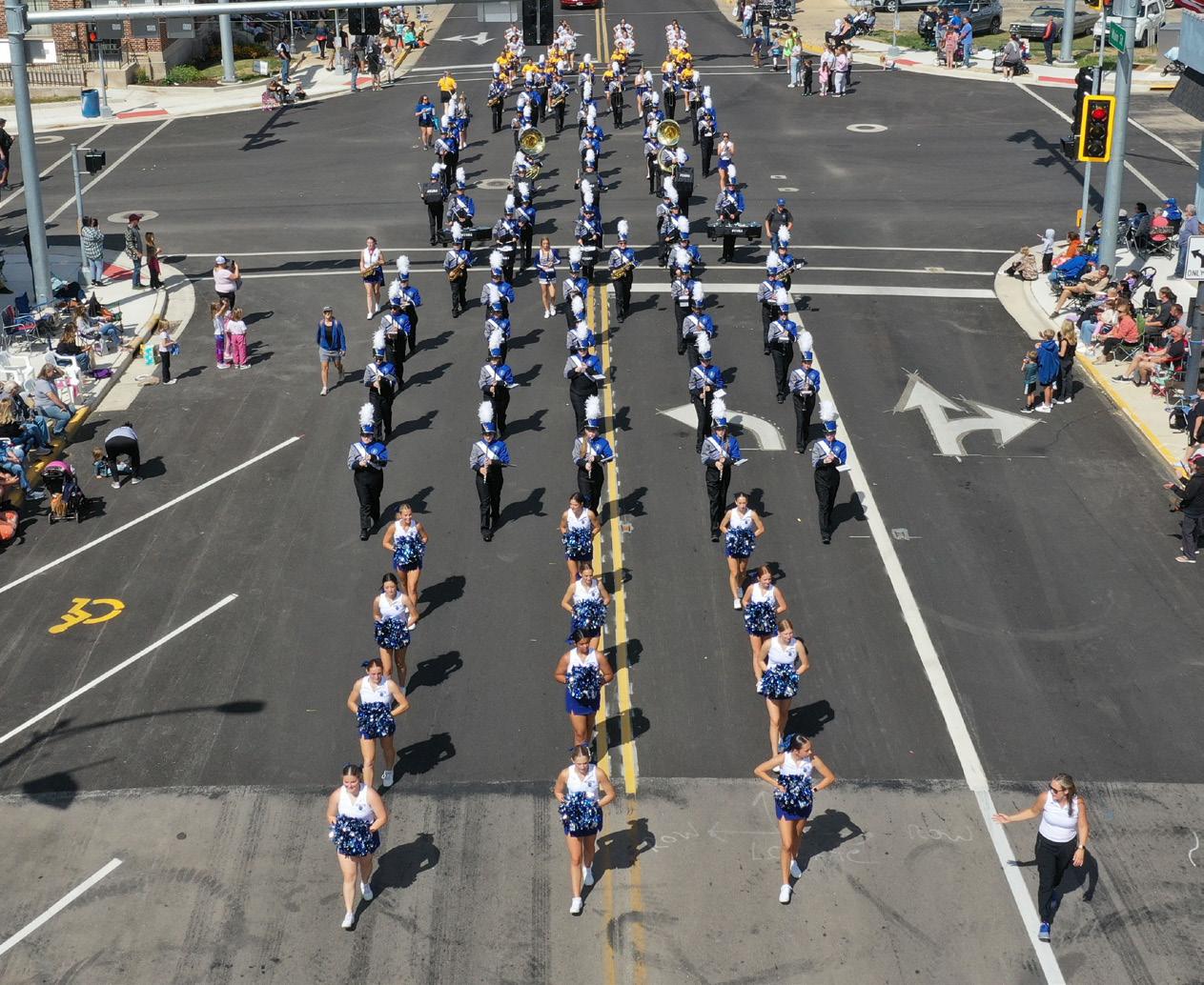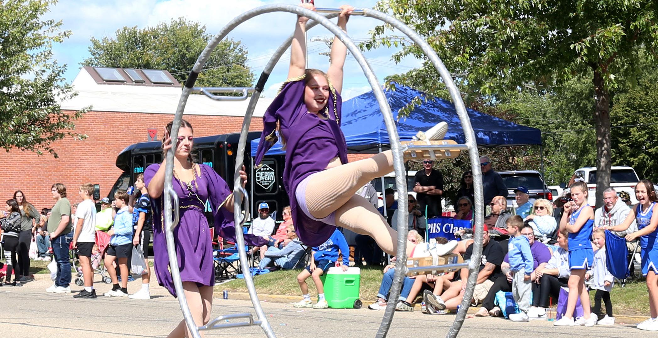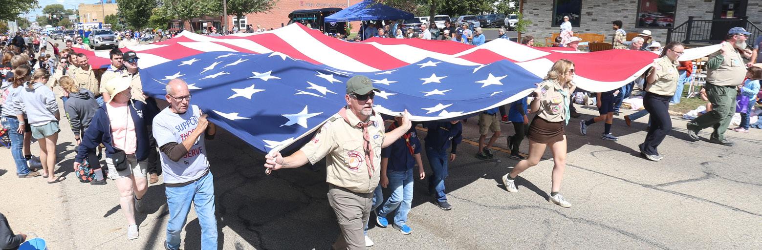 ABOVE LEFT: Boy Scouts and Cub Scouts carry a large American flag down South Main Street during the 54th annual Homestead Festival parade on Saturday, Sept. 6, in Princeton. LEFT: The Illinois State University Gamma Phi Circus performs during the 54th annual Homestead Festival parade on Saturday, Sept. 6, in Princeton. ABOVE: The Princeton High School poms and marching band walk down South Main Street during the 54th annual Homestead Festival parade on Saturday, Sept. 6, in Princeton.